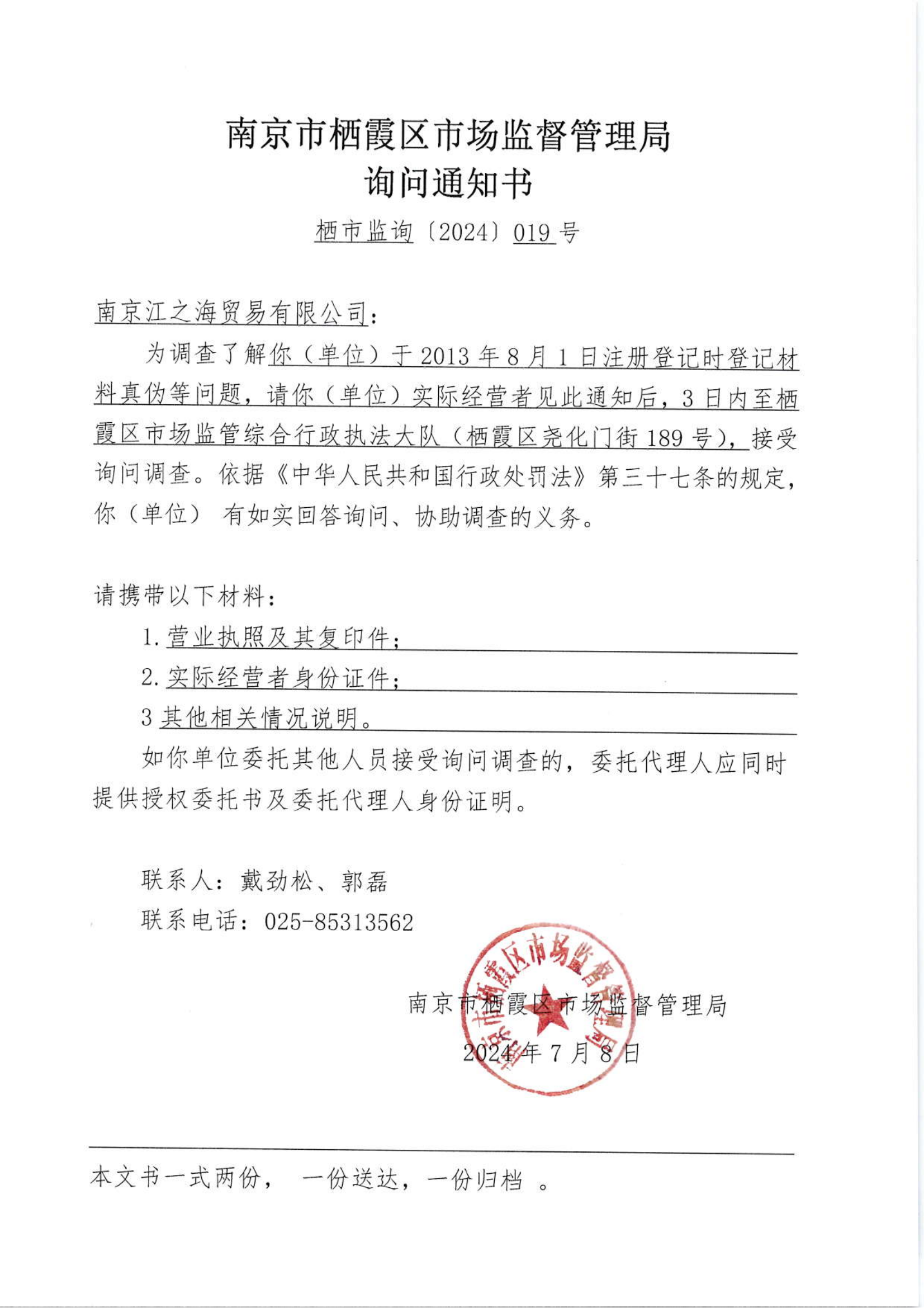 南京市棲霞區(qū)市場(chǎng)監(jiān)督管理局詢問通知書(南京江之海貿(mào)易有限公司)