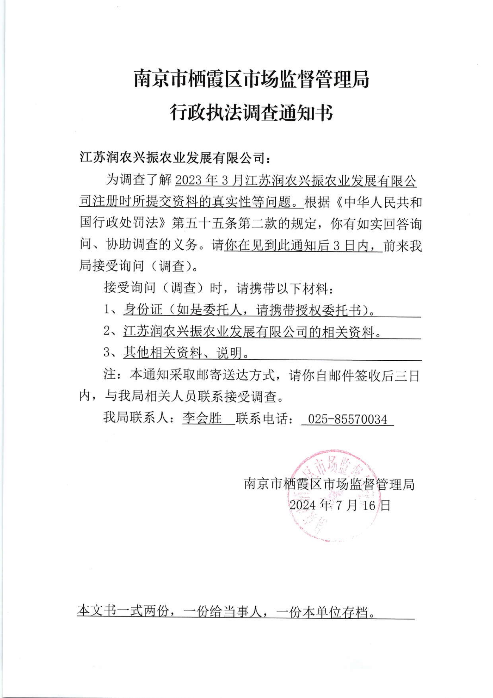 南京市棲霞區市場監督管理局行政執法調查通知書(江蘇潤農興振農業發展有限公司)