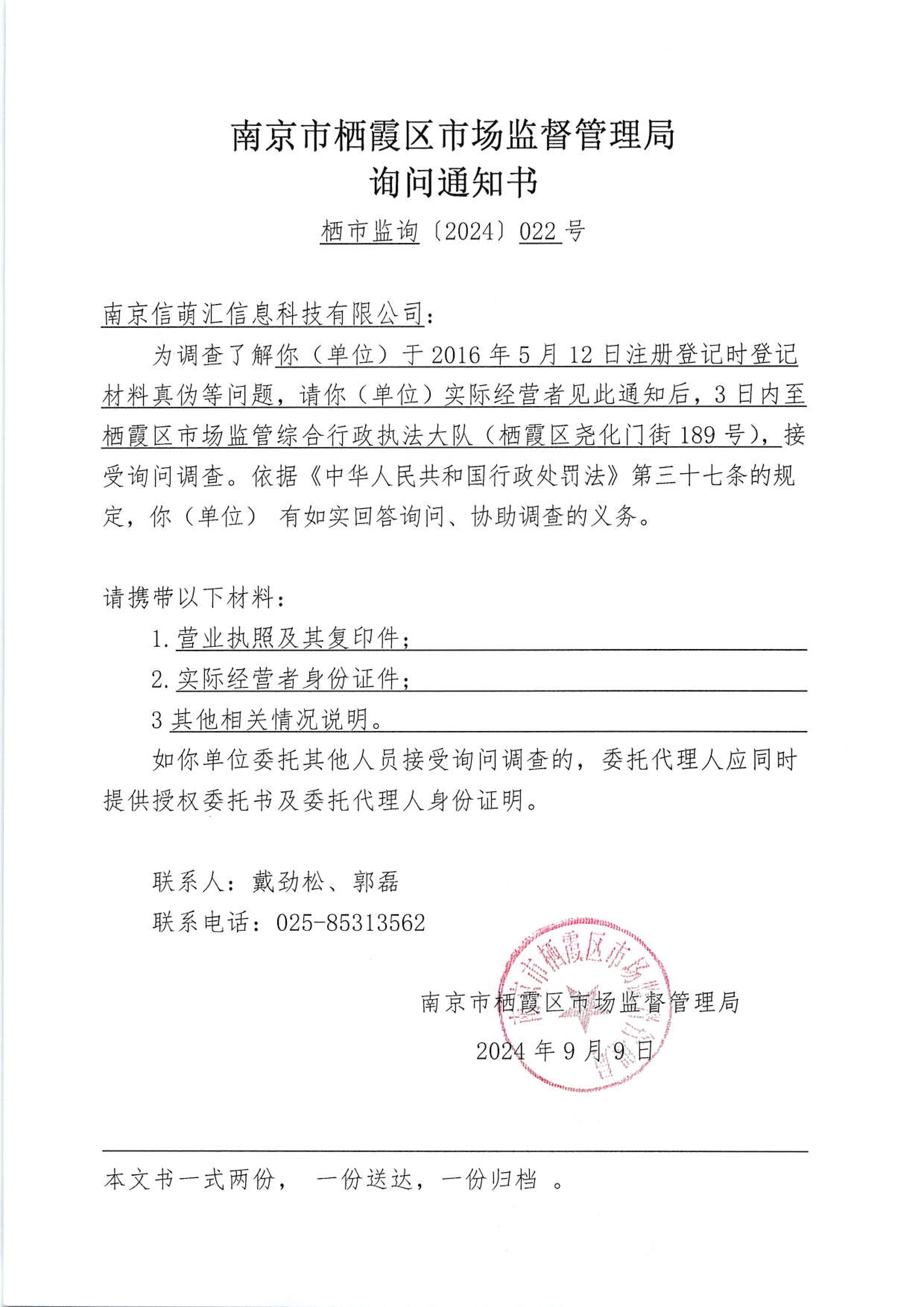 南京市棲霞區(qū)市場監(jiān)督管理局詢問通知書(南京信萌匯信息科技有限公司)