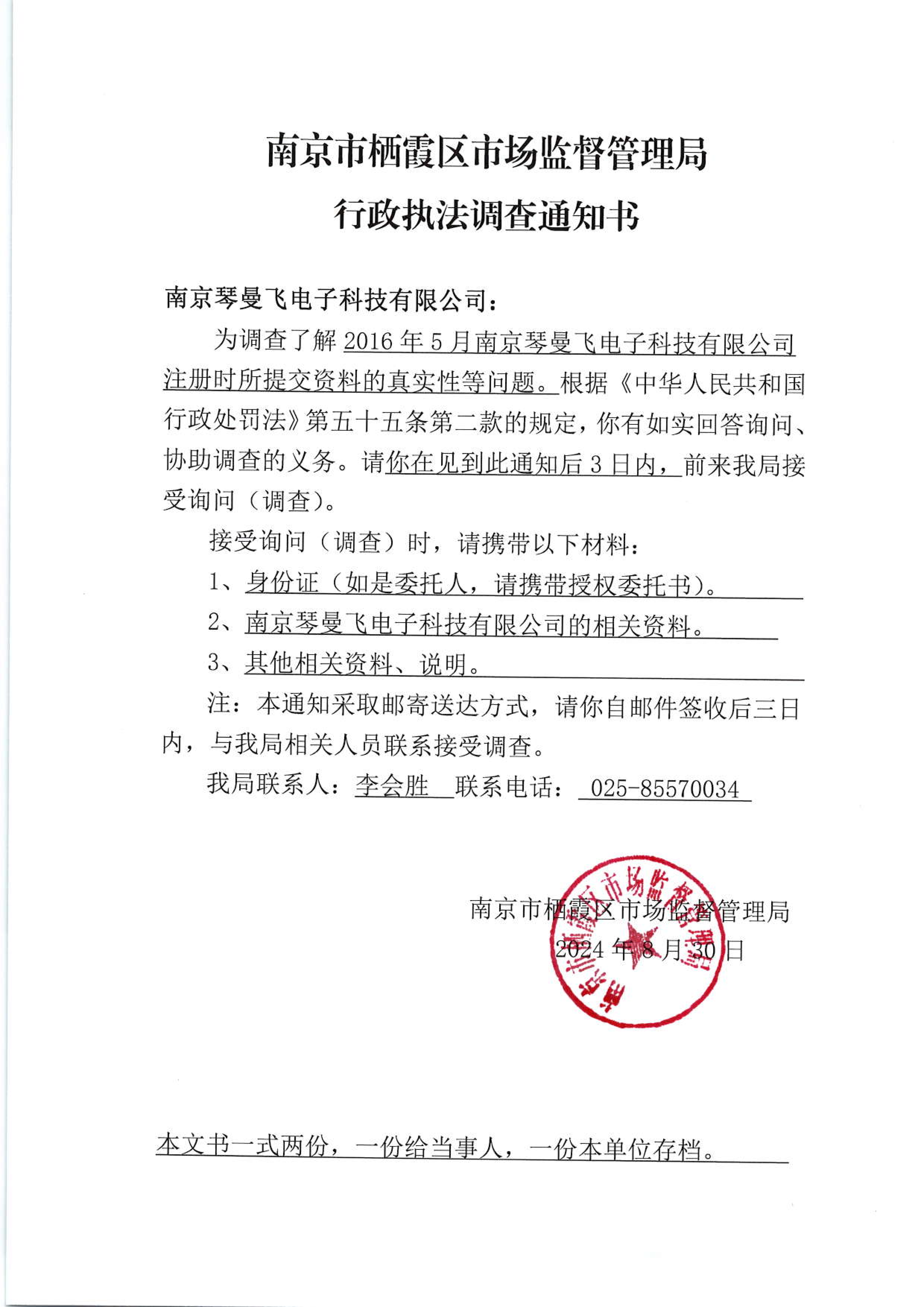 南京市棲霞區市場監督管理局行政執法調查通知書(南京琴曼飛電子科技有限公司)