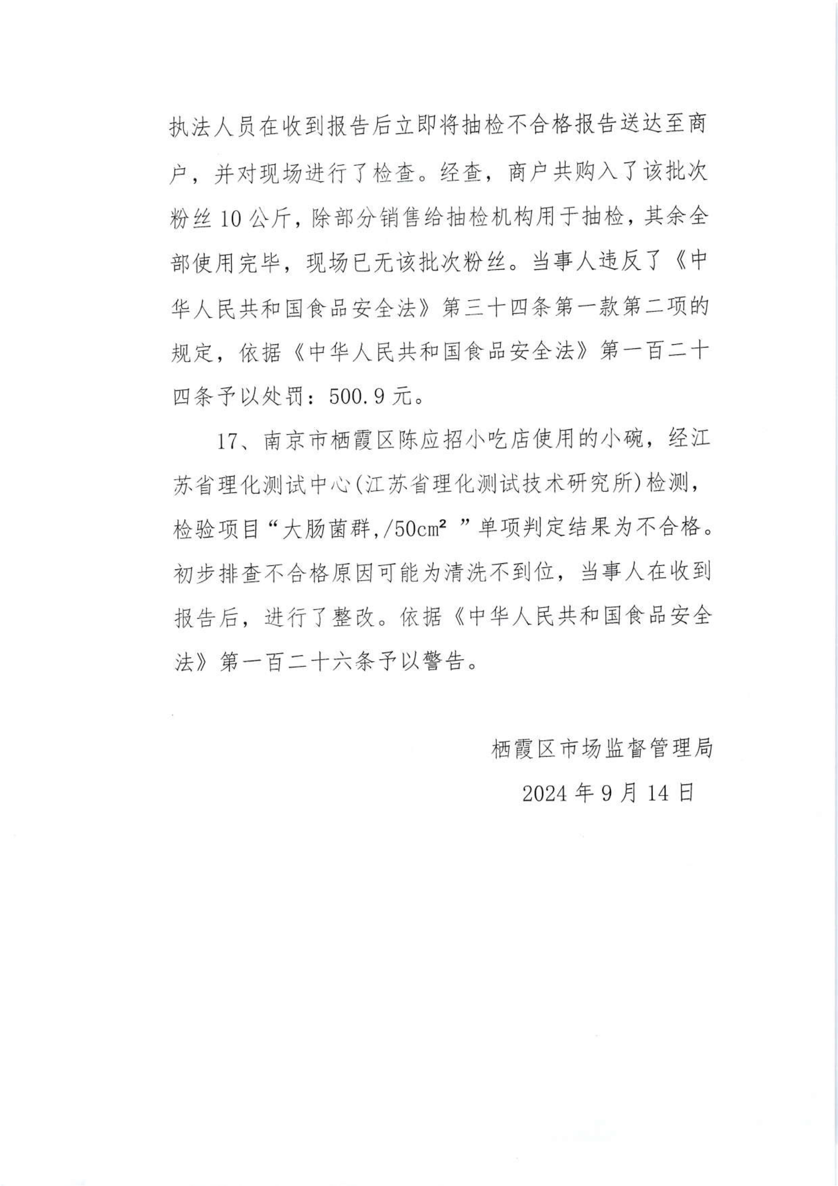 關于2024年棲霞區市場監管局部門市級抽檢不合格食品的核查處置情況的公告(9.14)