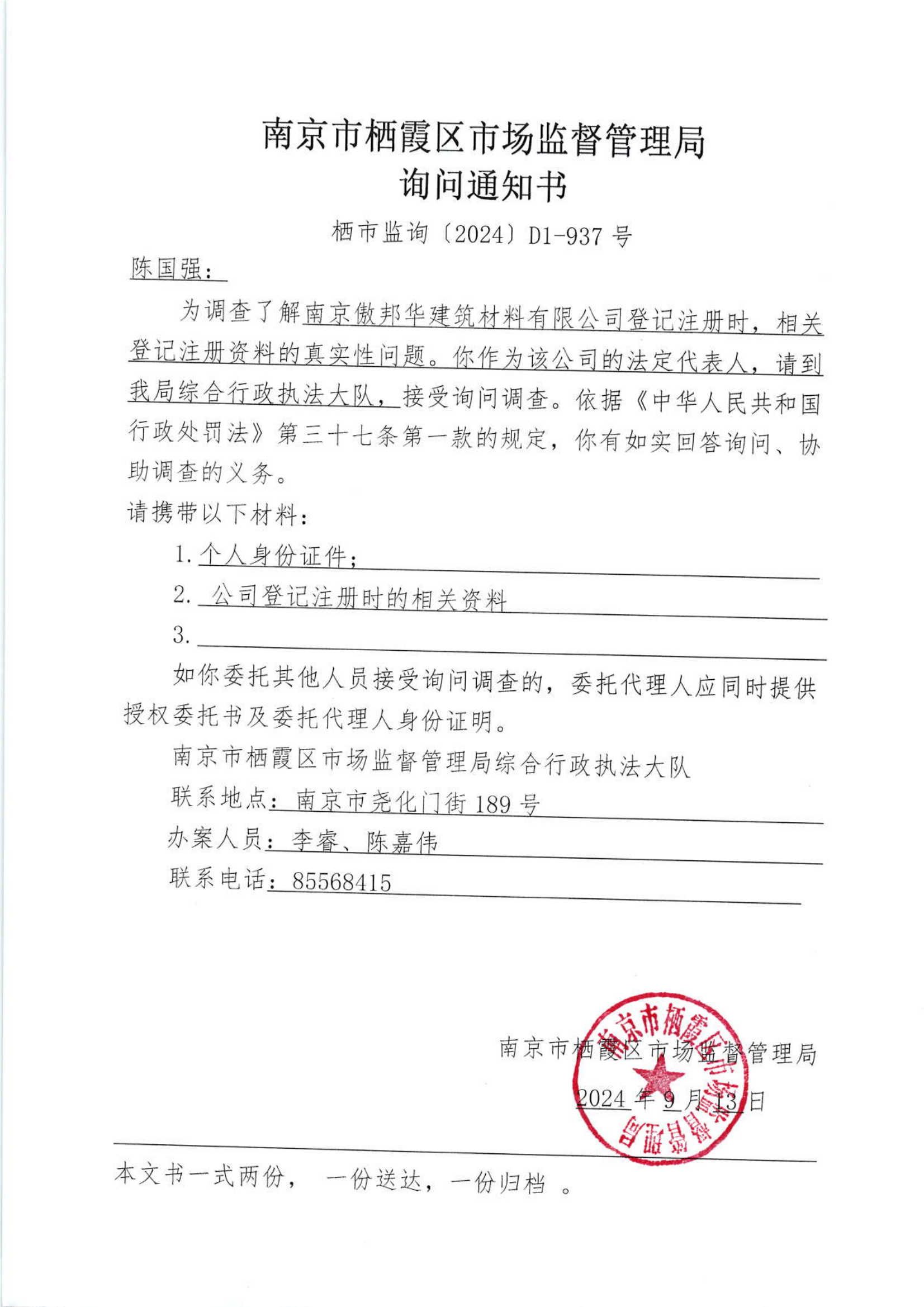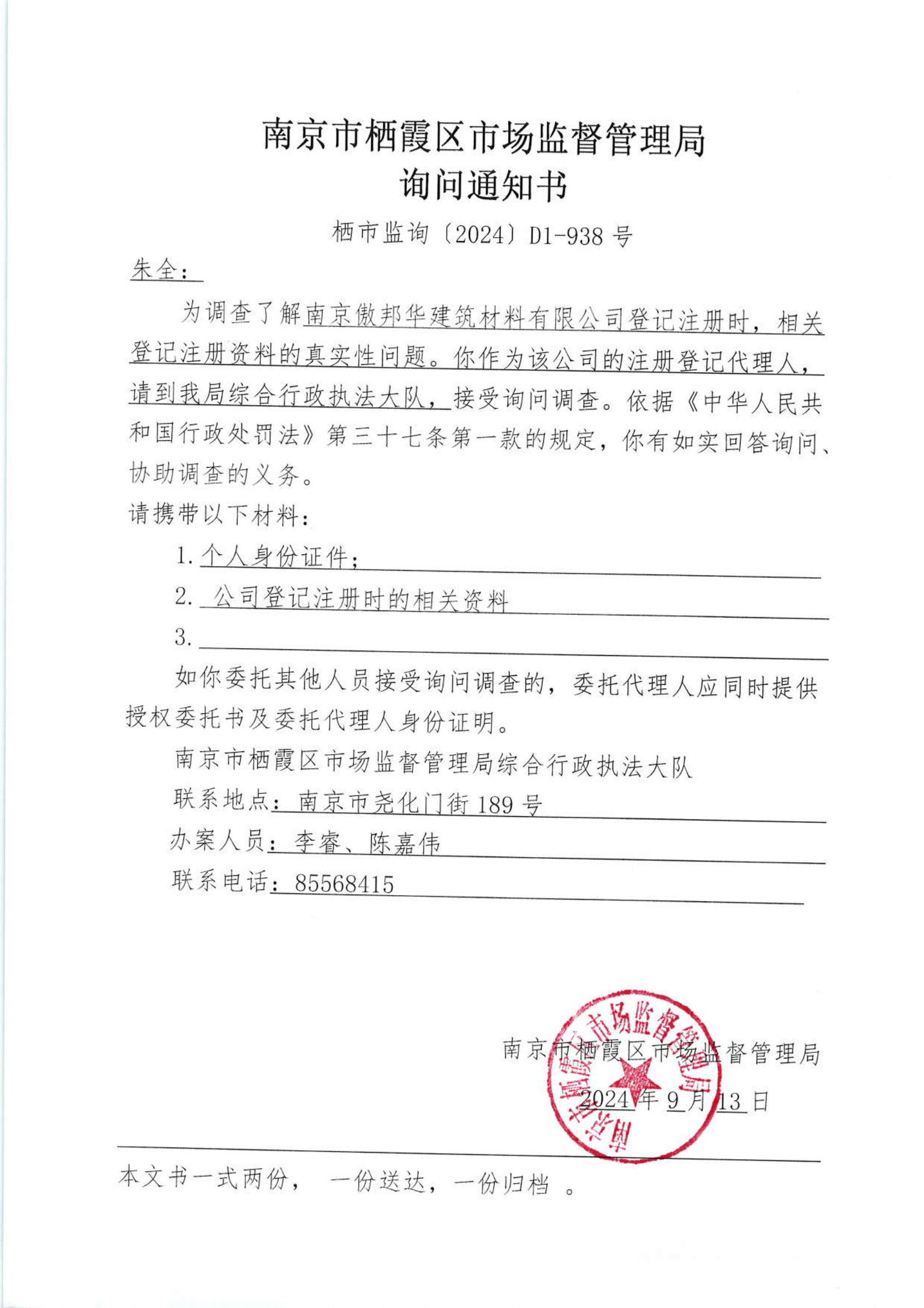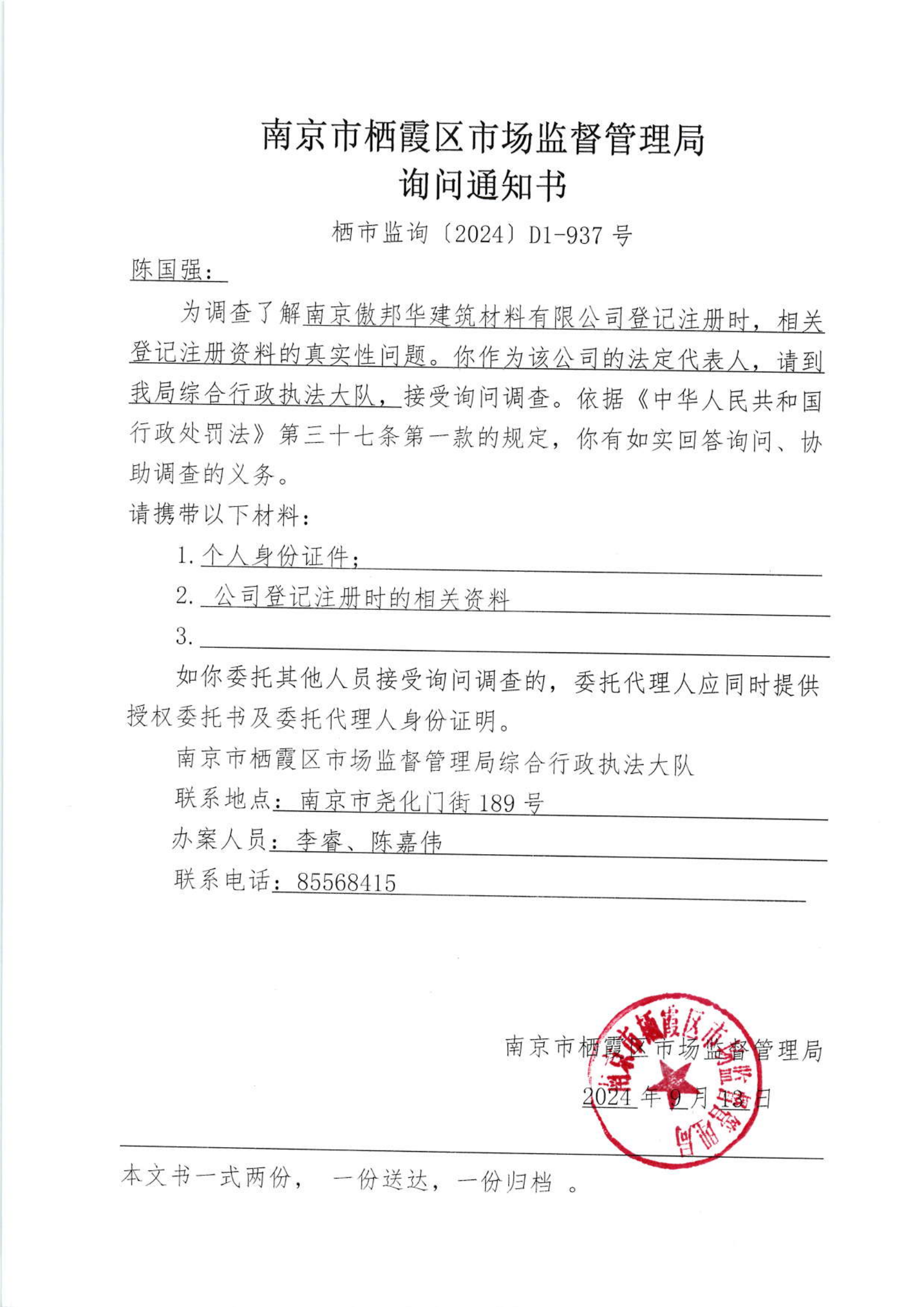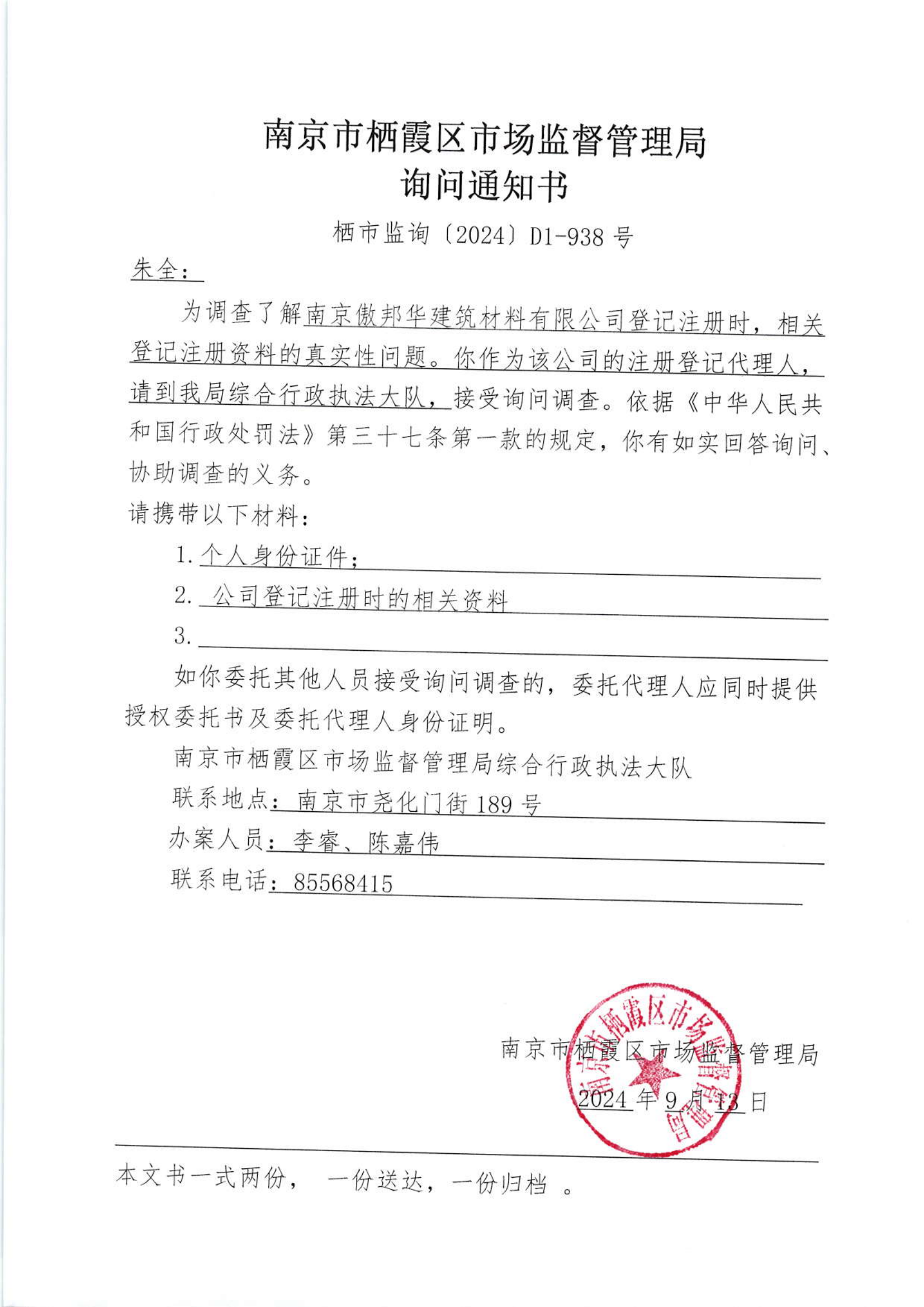 南京市棲霞區市場監督管理局詢問通知書(南京傲邦華建筑材料有限公司)