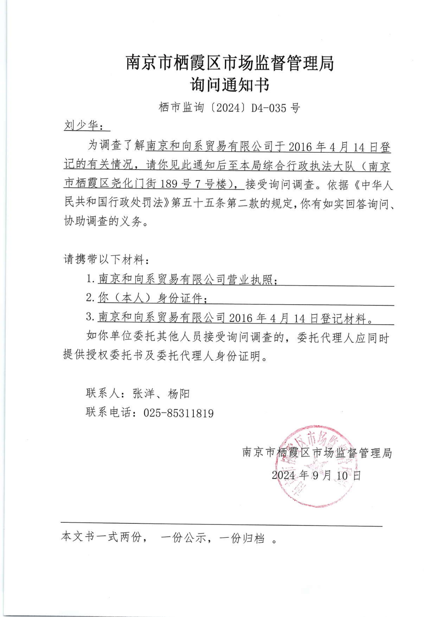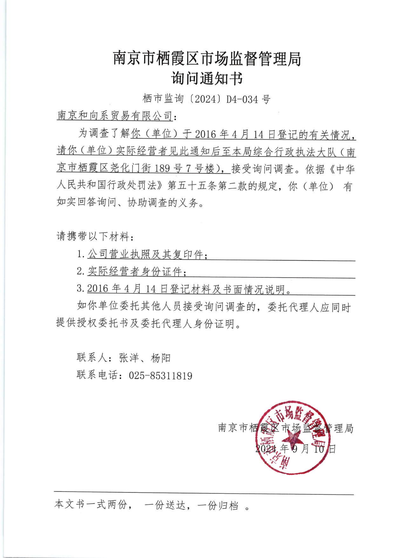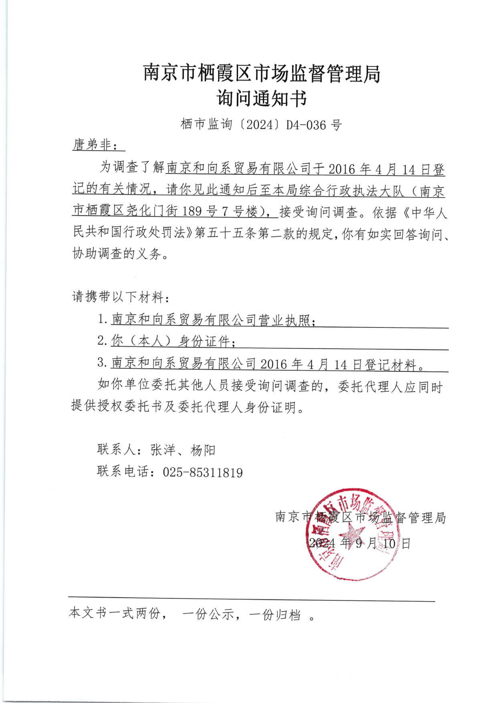 南京市棲霞區市場監督管理局詢問通知書(南京和向系貿易有限公司)