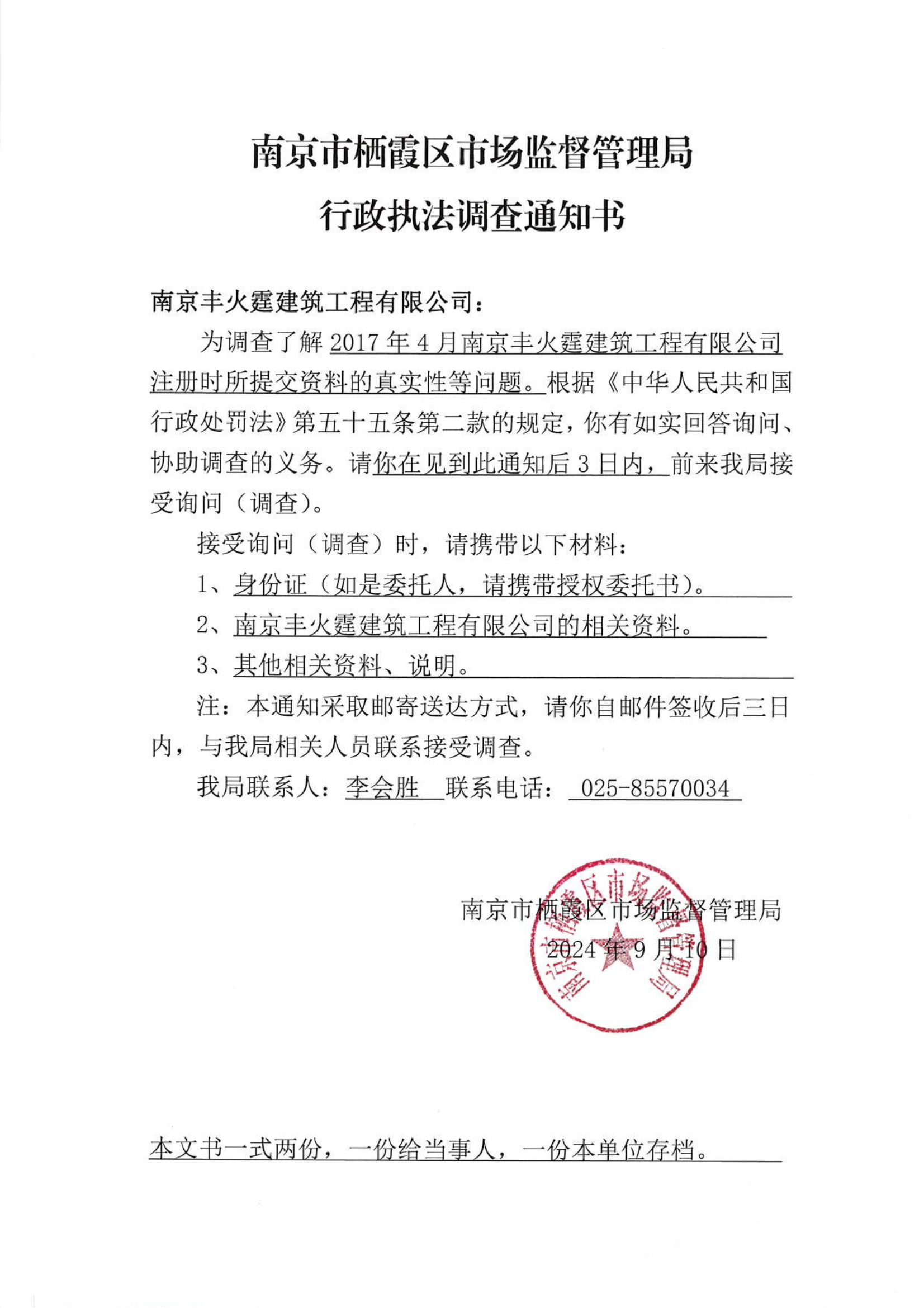 南京市棲霞區(qū)市場監(jiān)督管理局行政執(zhí)法調(diào)查通知書(南京豐火霆建筑工程有限公司)