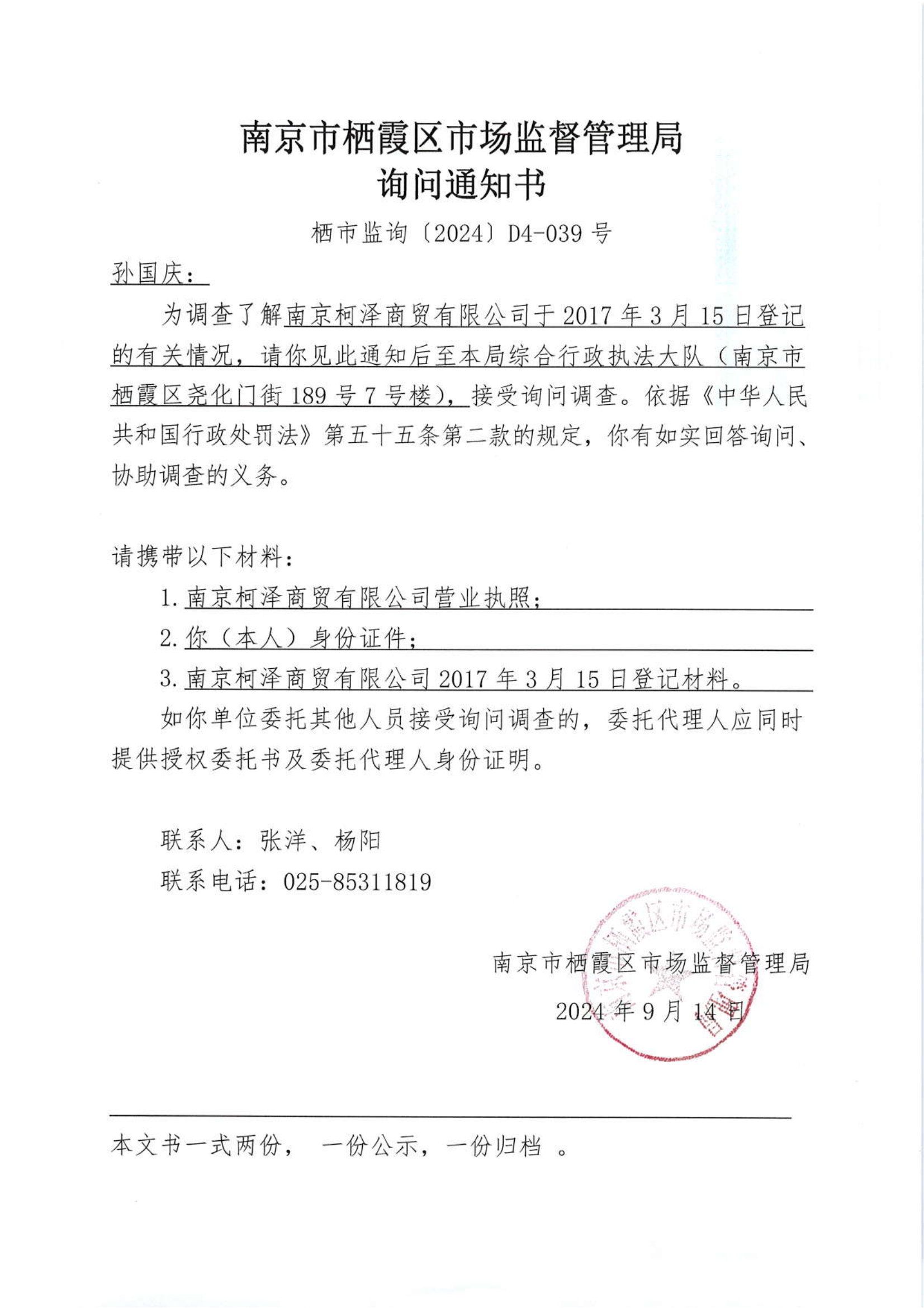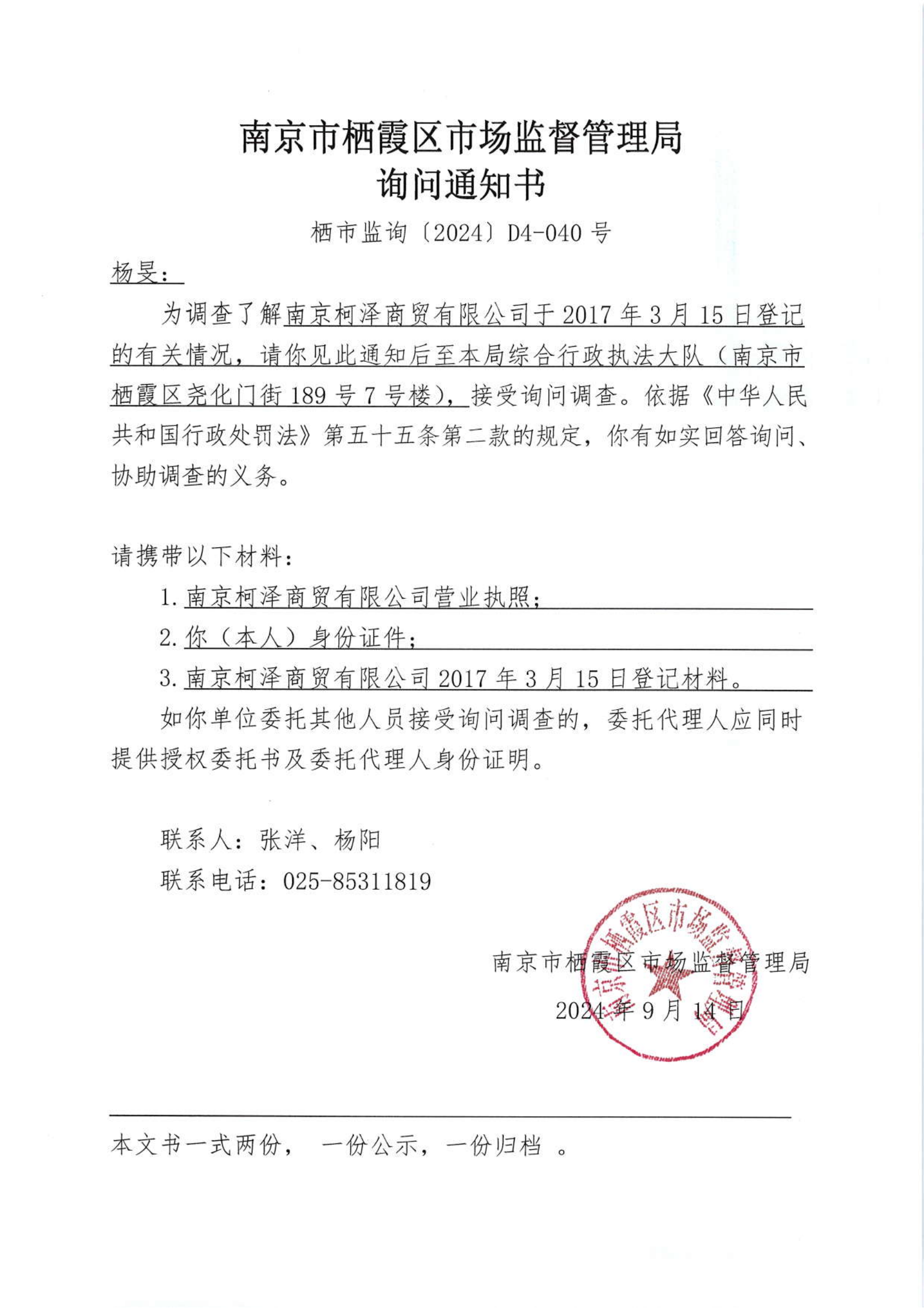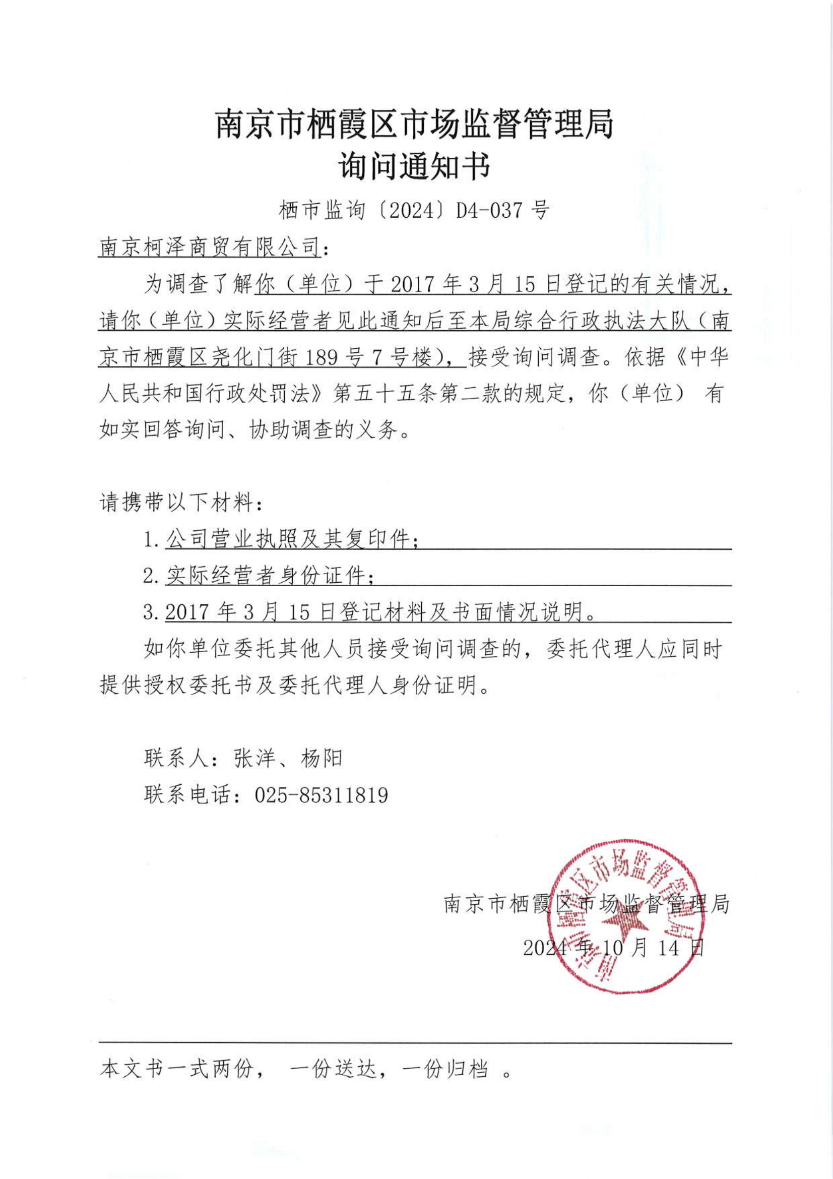南京市棲霞區(qū)市場監(jiān)督管理局詢問通知書(南京柯澤商貿(mào)有限公司)