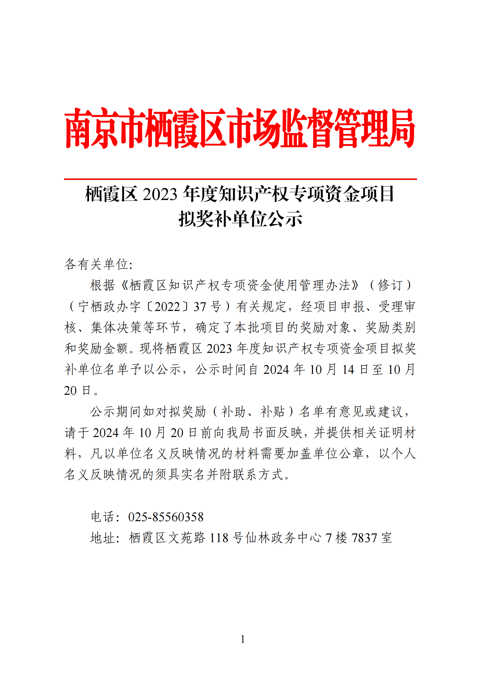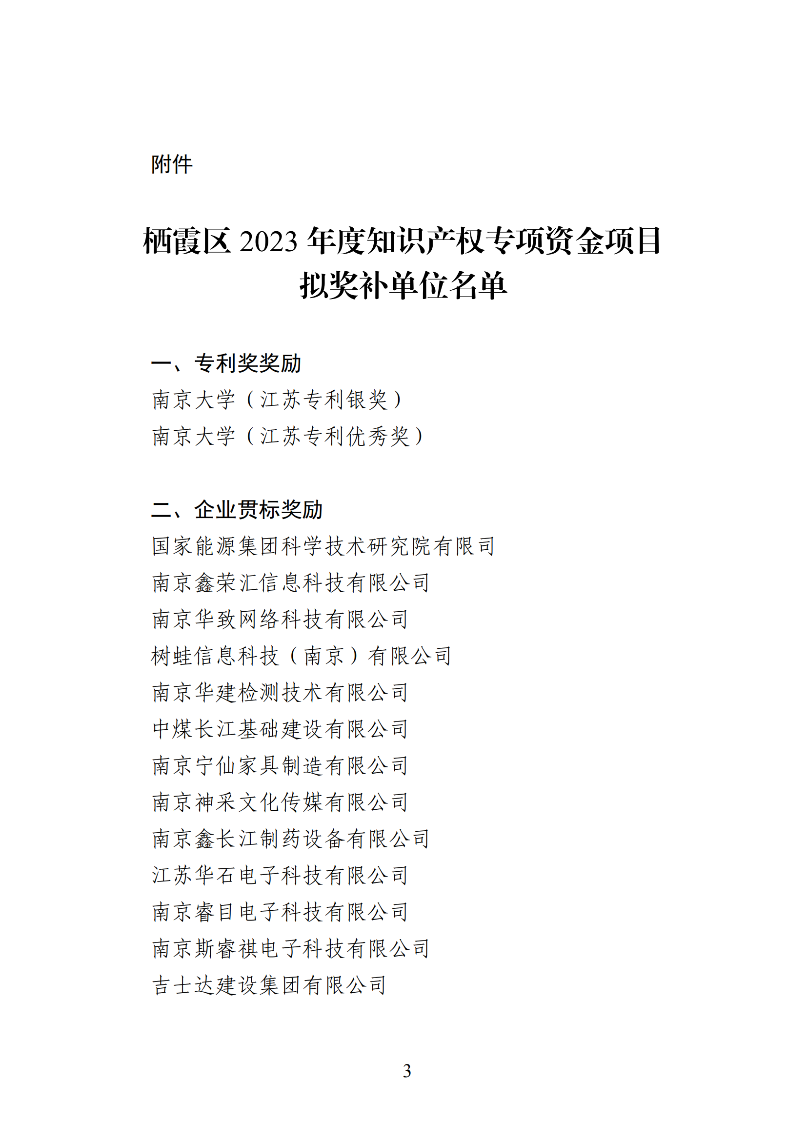 棲霞區2023年度知識產權專項資金項目擬獎補單位公示