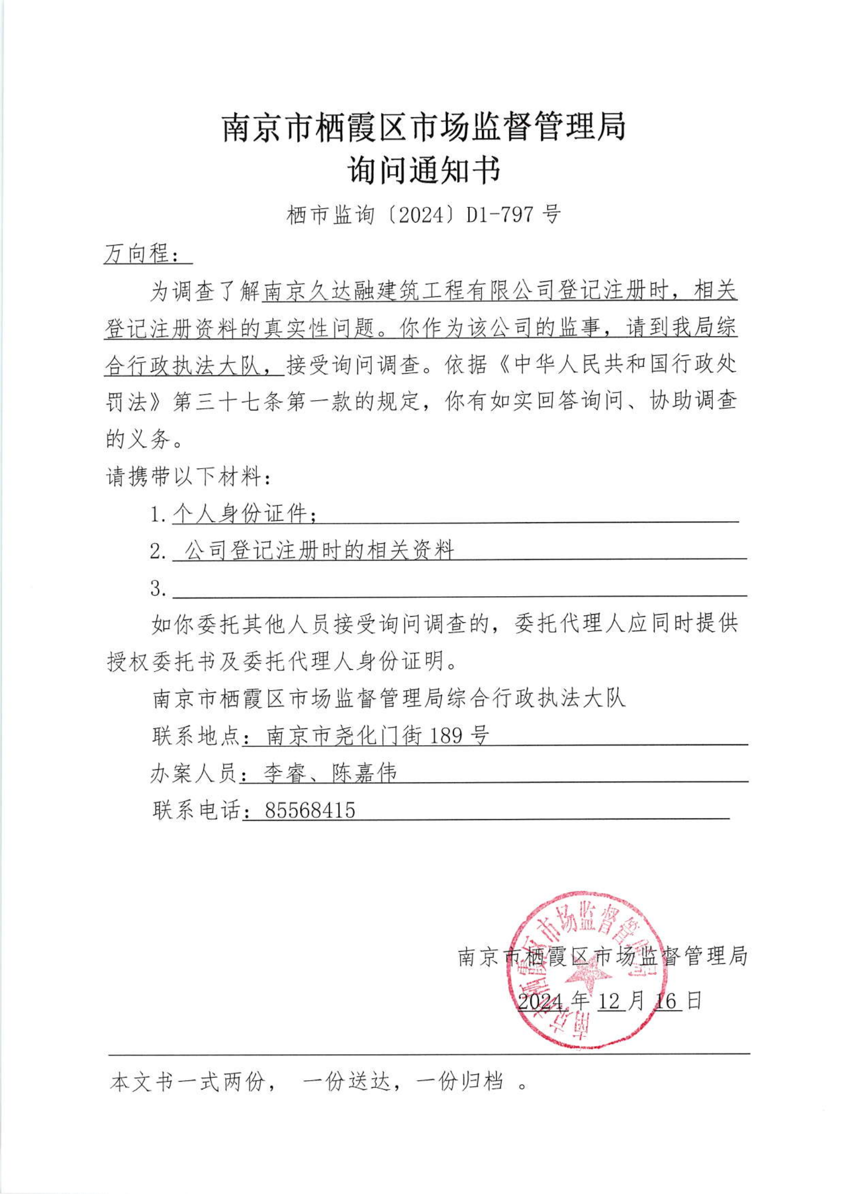 信息名稱:    南京市棲霞區市場監督管理局詢問通知書(南京久達融建筑工程有限公司)