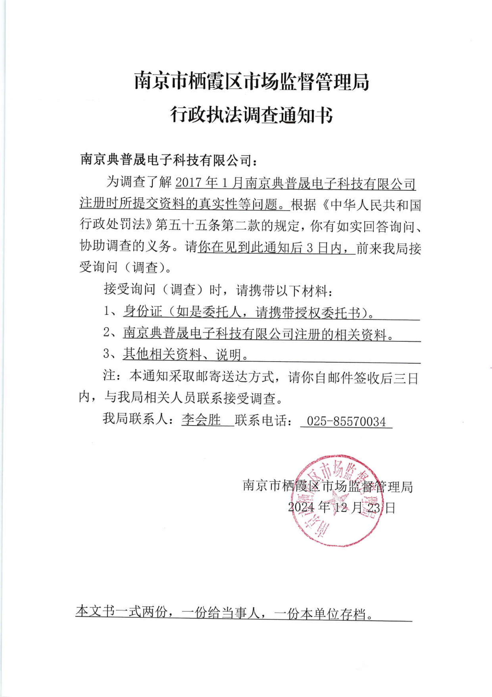 南京市棲霞區市場監督管理局行政執法調查通知書(南京典普晟電子科技有限公司)