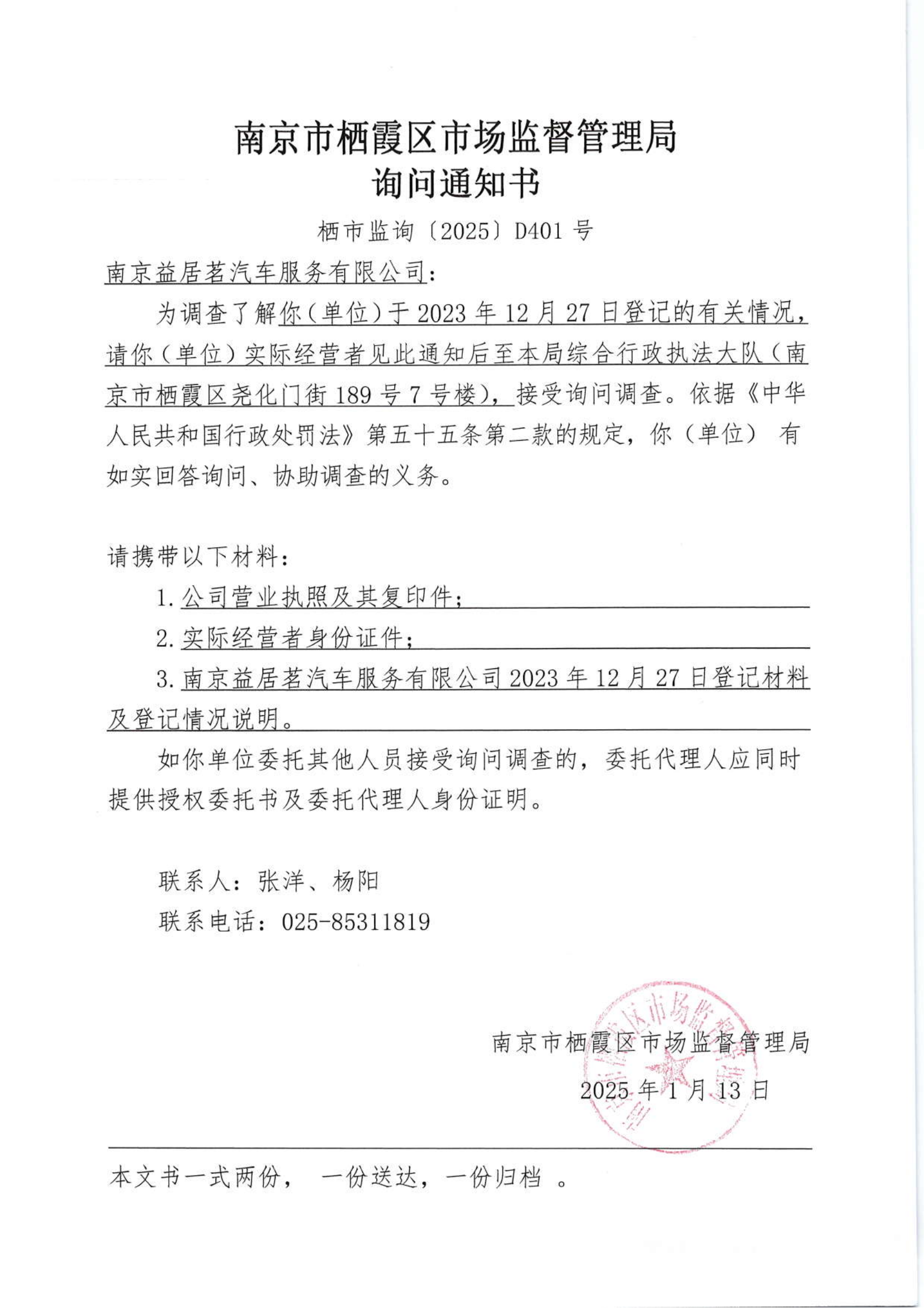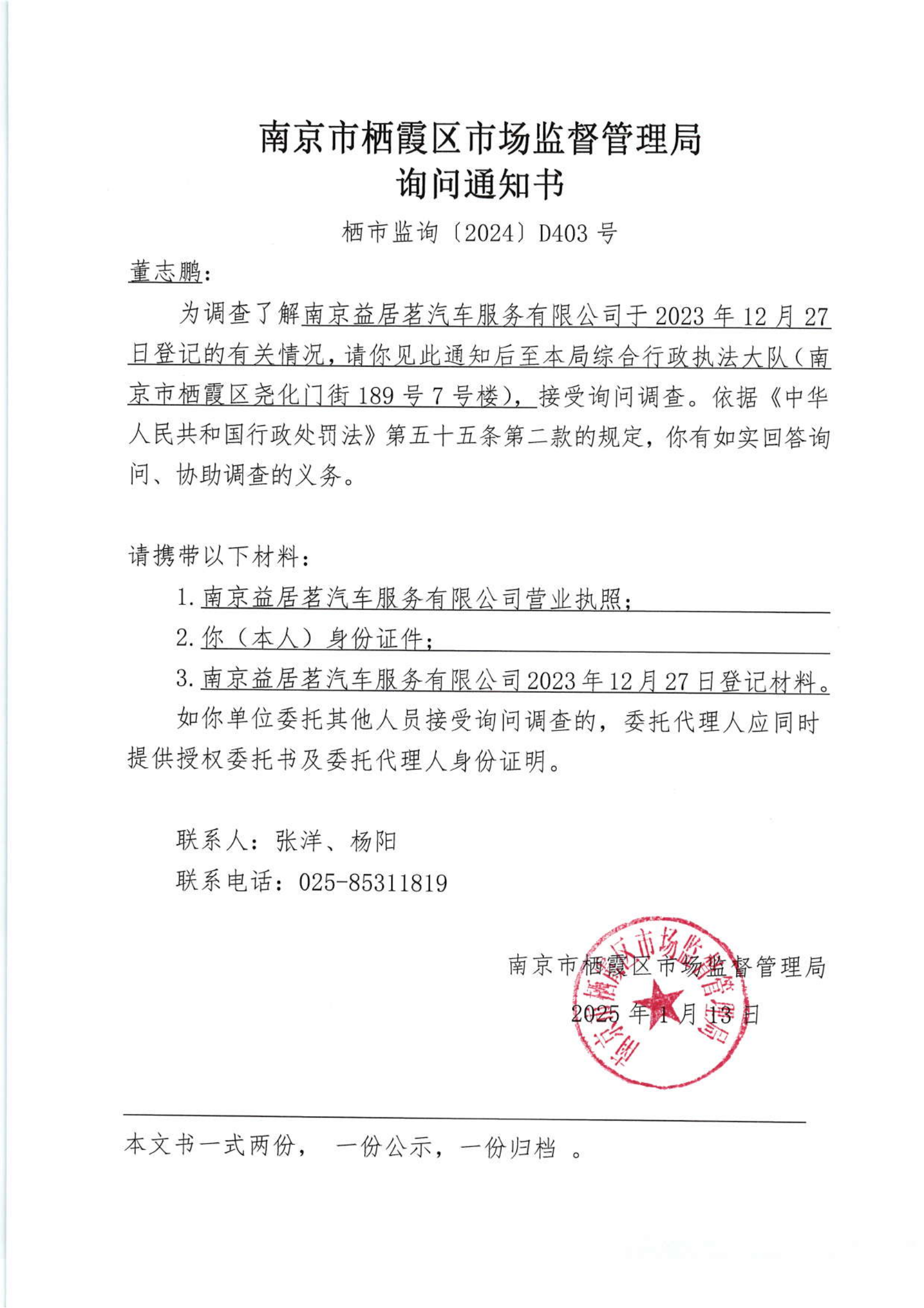 南京市棲霞區市場監督管理局詢問通知書(南京益居茗汽車服務有限公司)