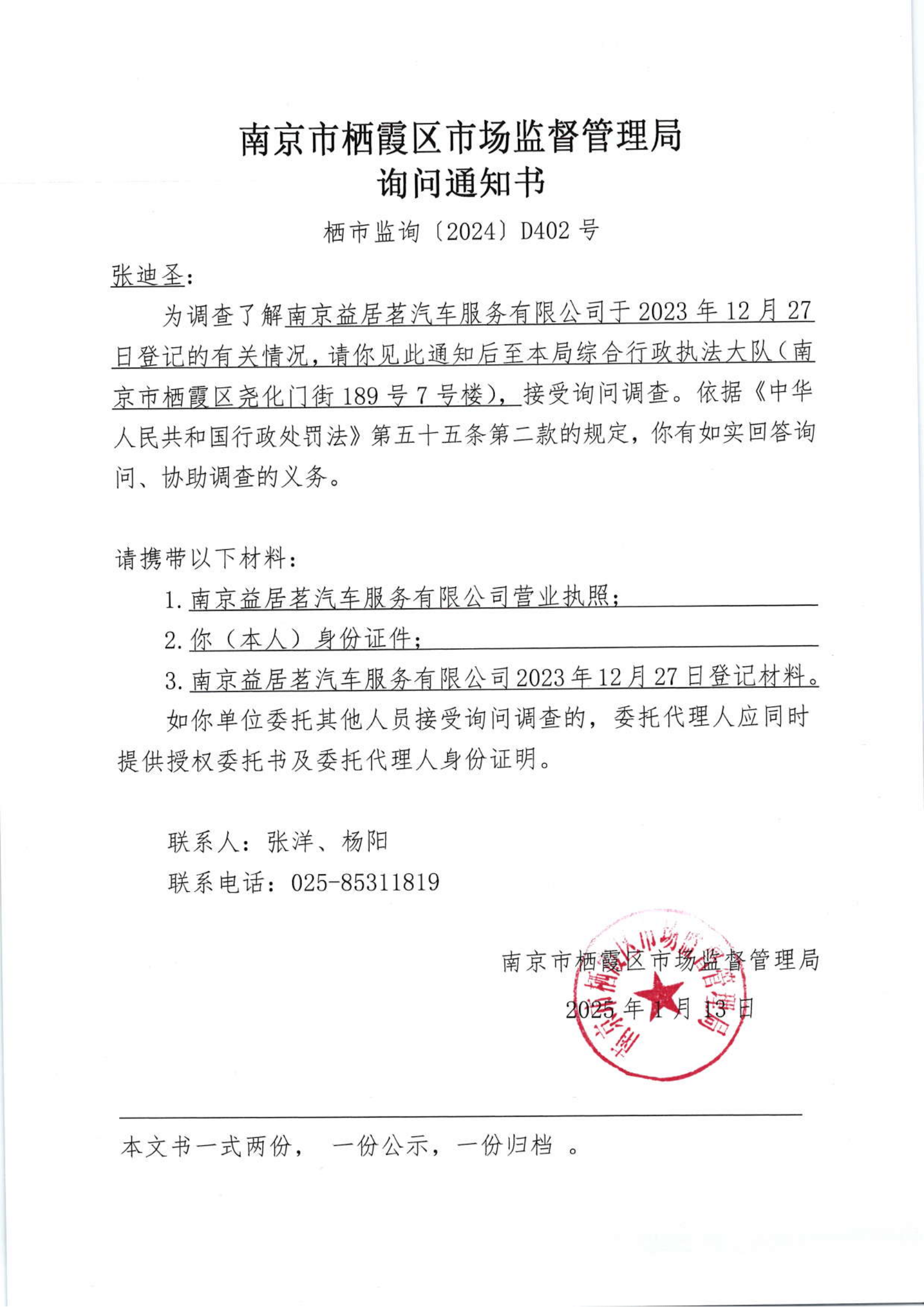 信息名稱:    南京市棲霞區市場監督管理局詢問通知書(南京益居茗汽車服務有限公司)