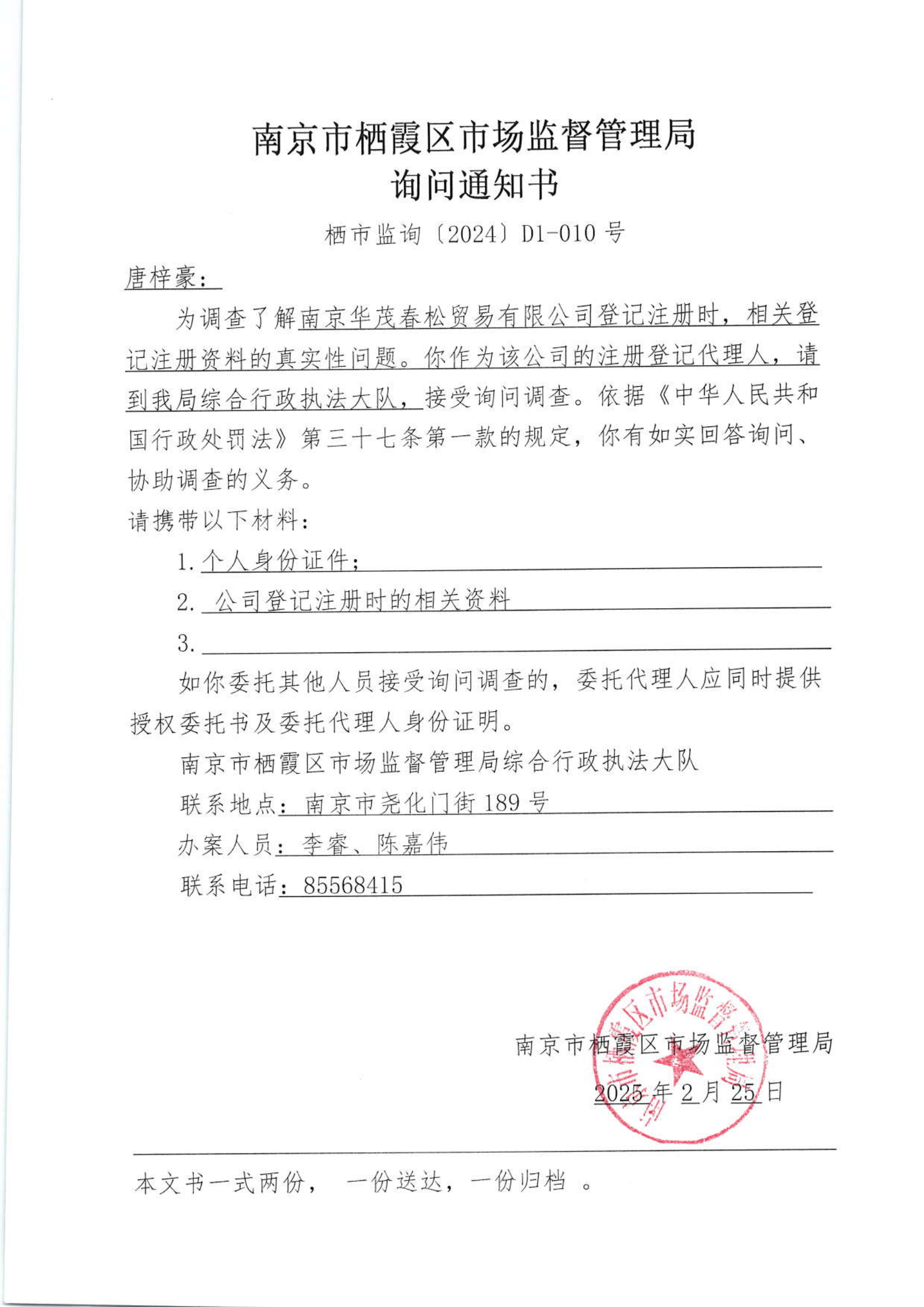 南京市棲霞區市場監督管理局詢問通知書(南京華茂春松貿易有限公司 )