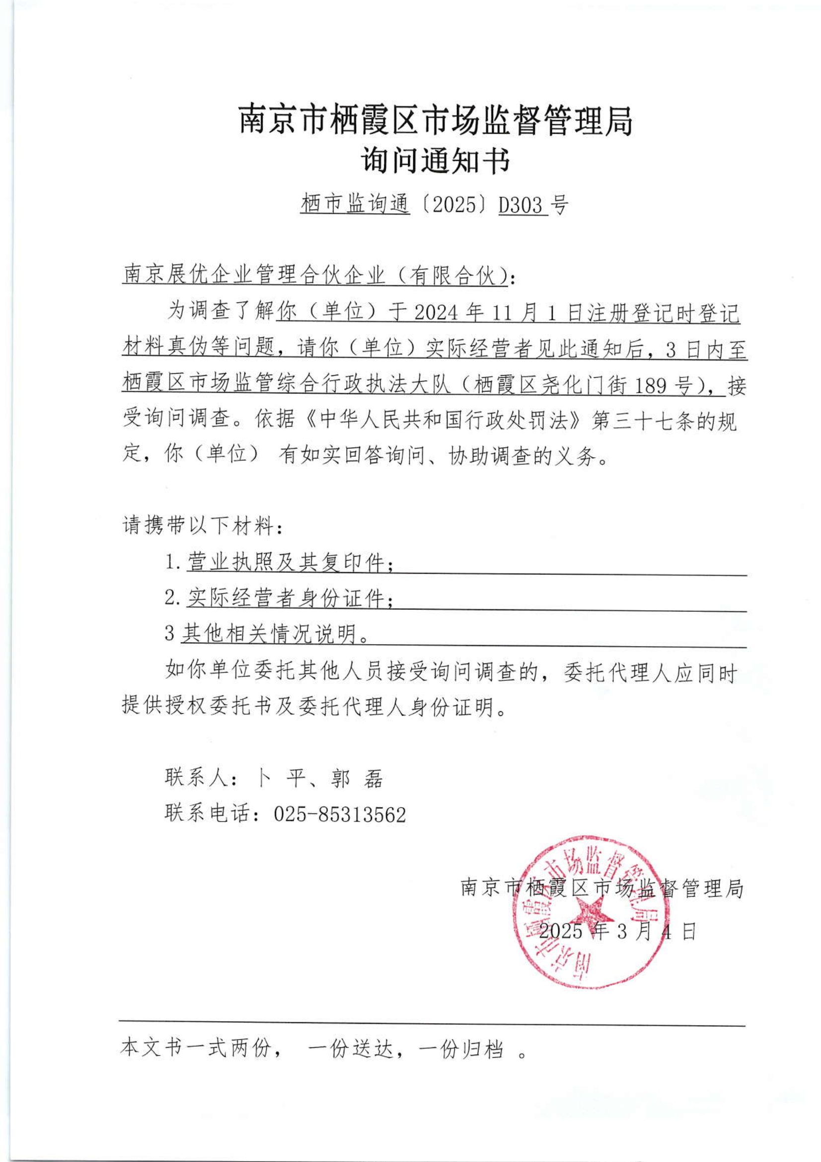 南京市棲霞區市場監督管理局詢問通知書(南京展優企業管理合伙企業(有限合伙))