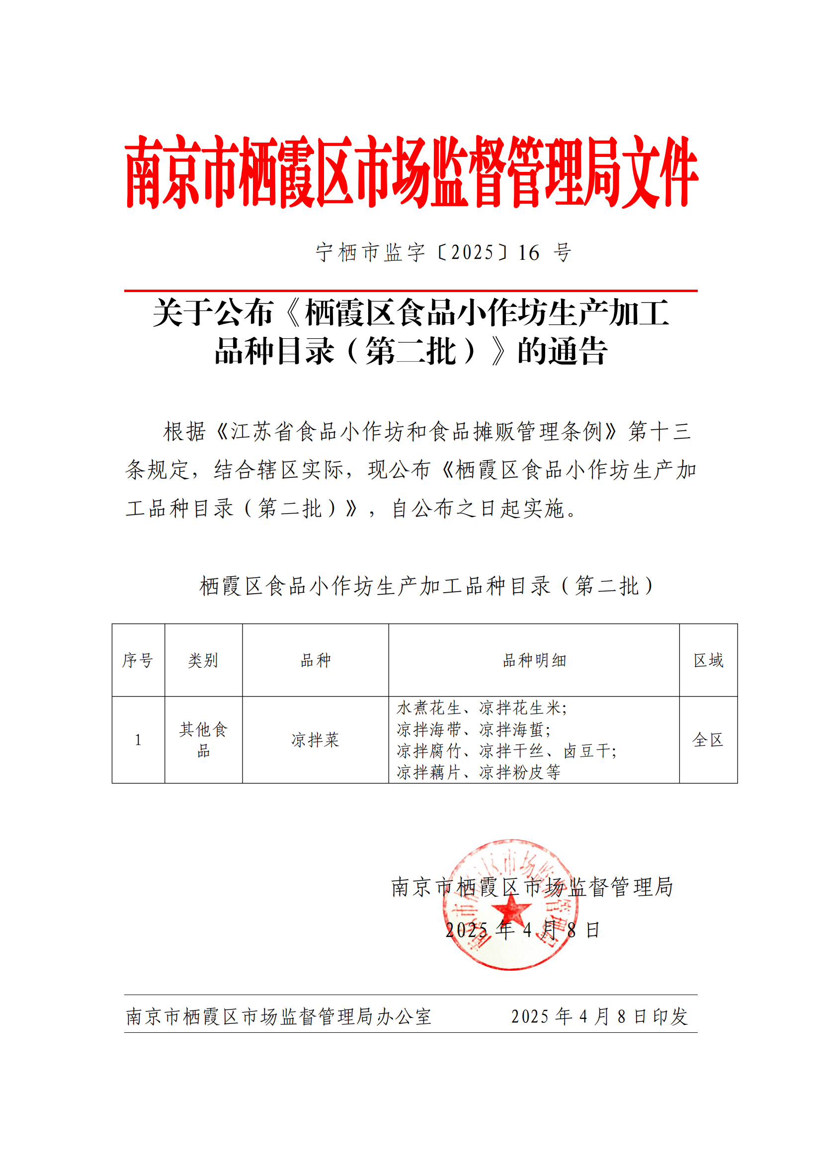 關于公布《棲霞區食品小作坊生產加工品種目錄(第二批)》的通告