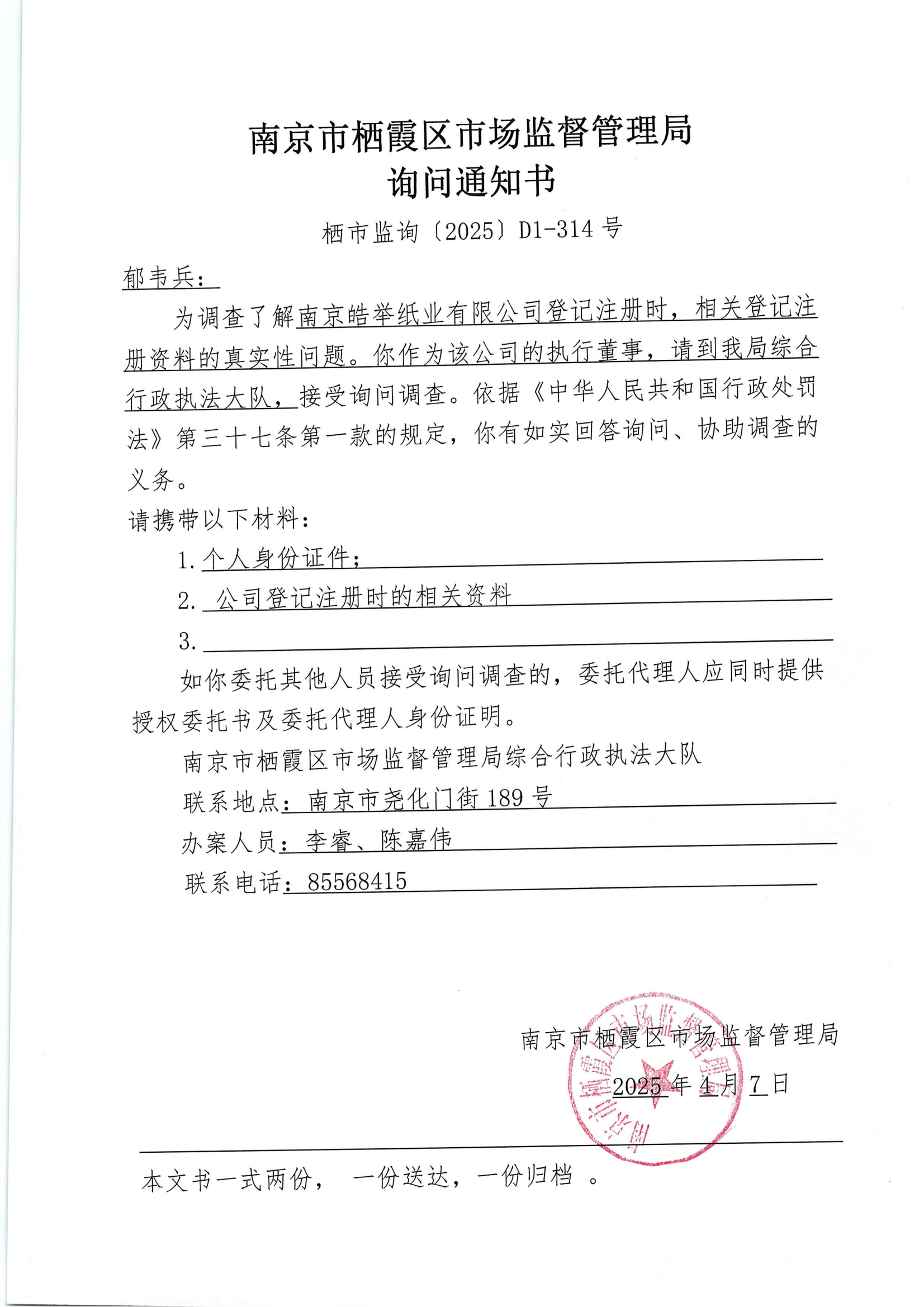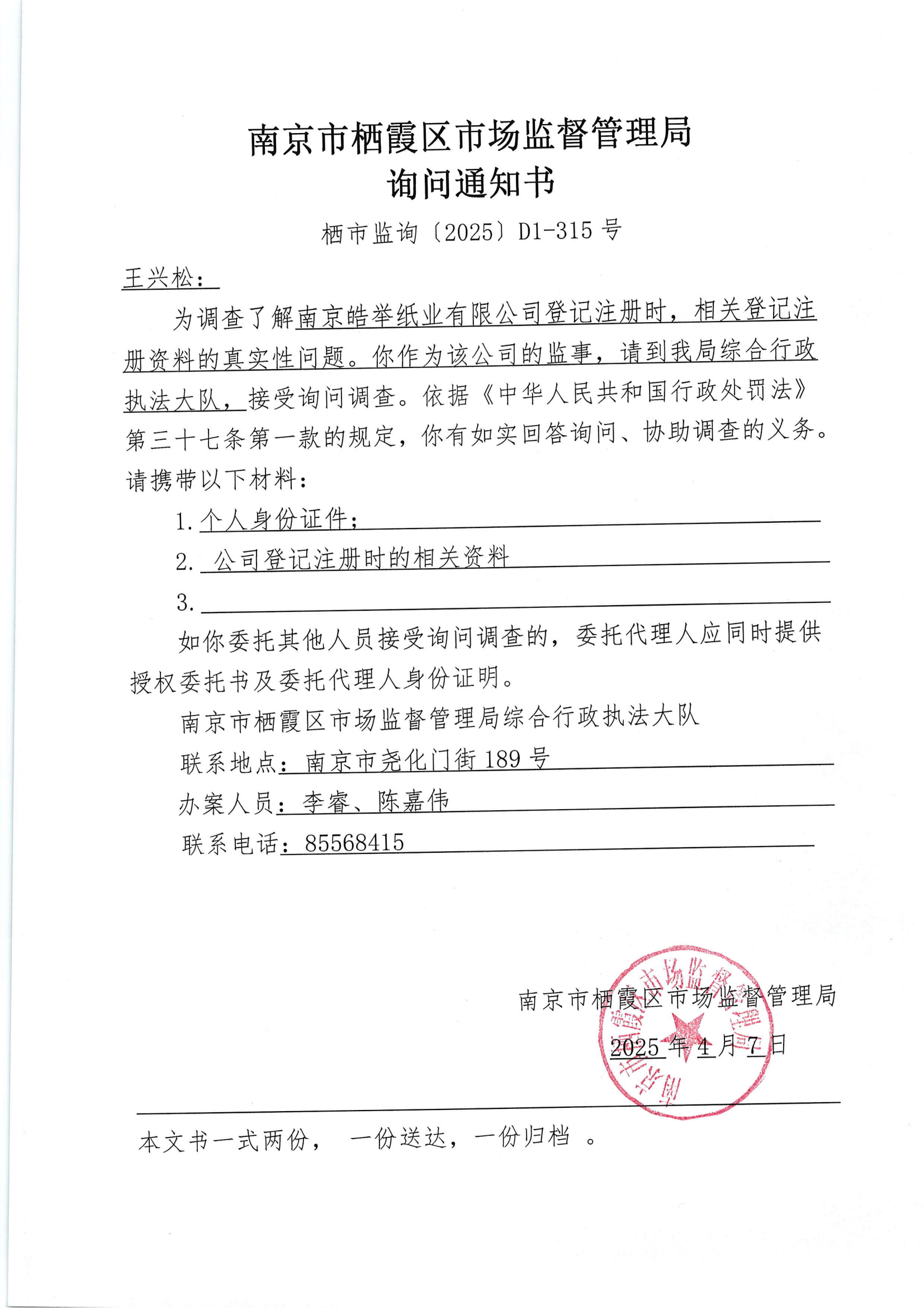 南京市棲霞區市場監督管理局詢問通知書(南京皓舉紙業有限公司)