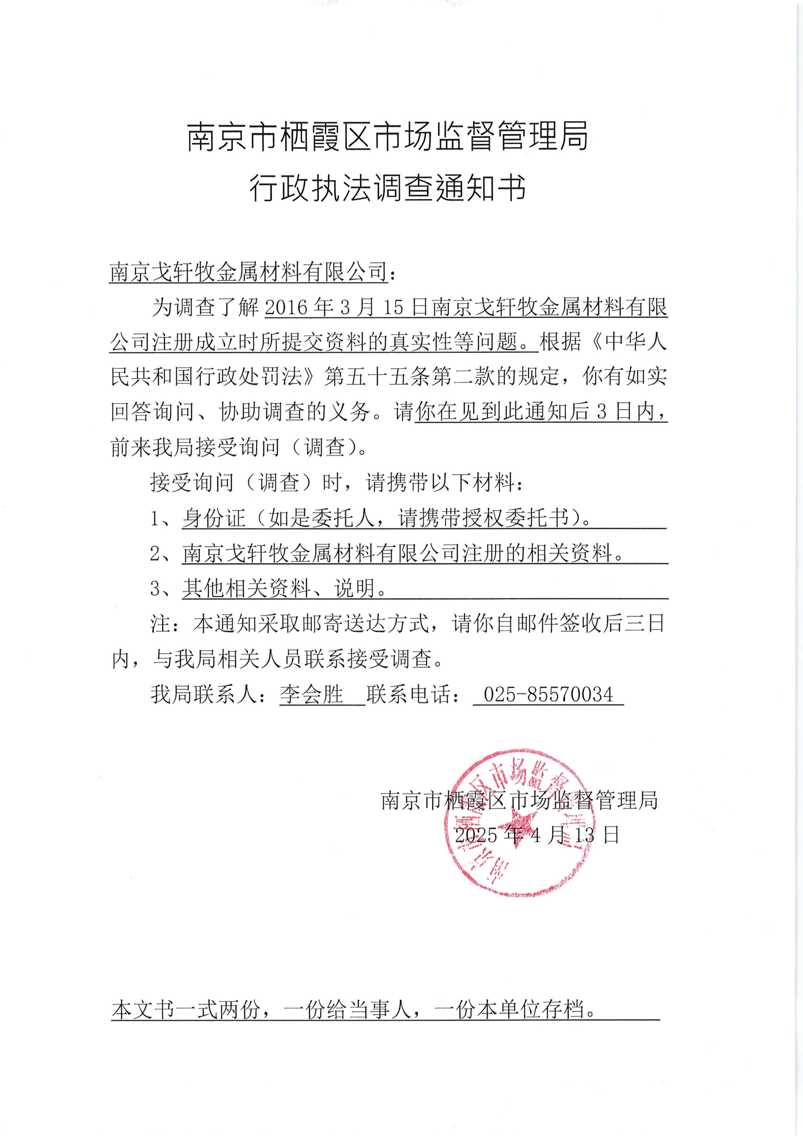 南京市棲霞區市場監督管理局行政執法調查通知書(南京戈軒牧金屬材料有限公司)