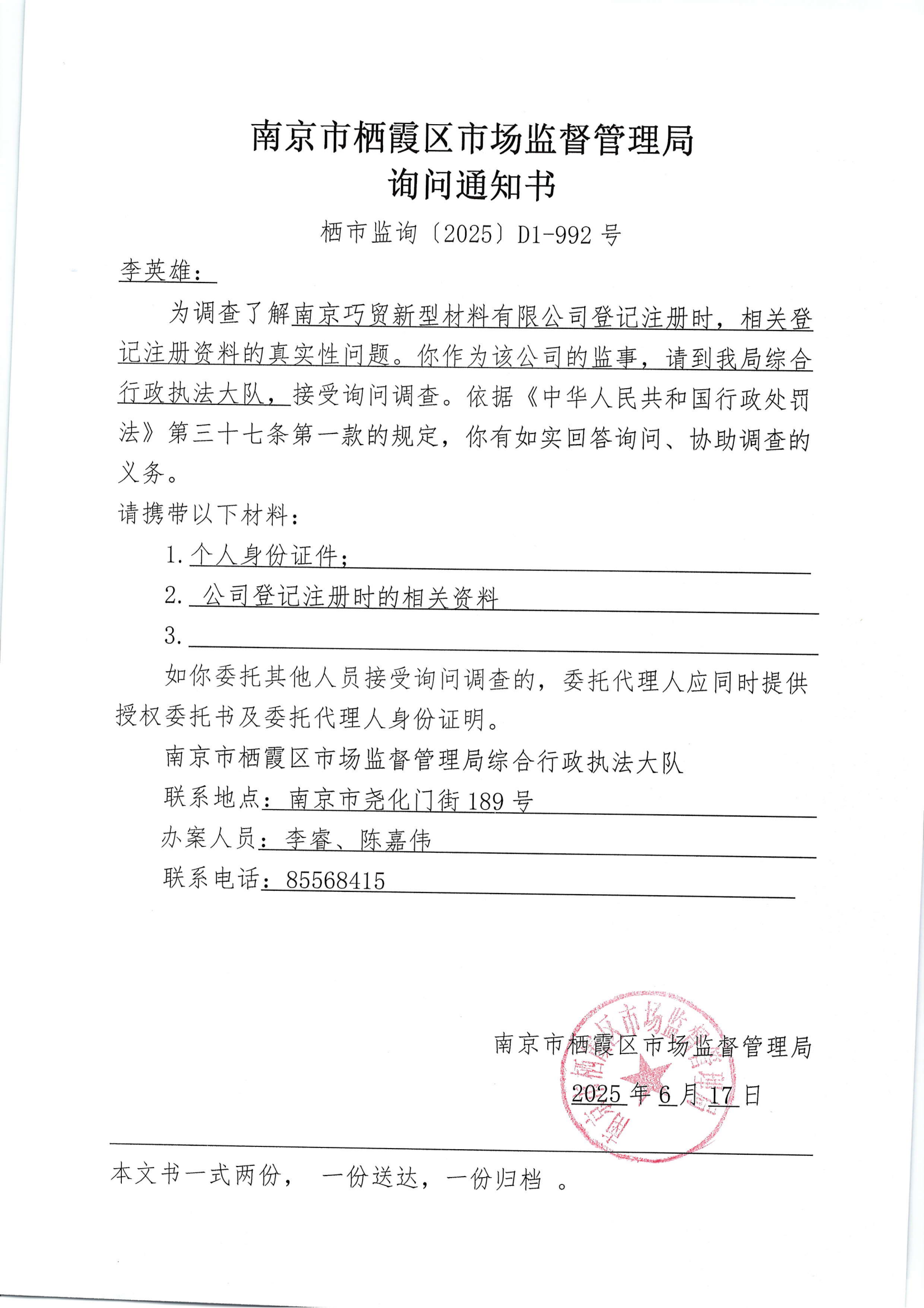 信息名稱:    棲霞區市場監督管理局詢問通知書(南京巧貿新型材料有限公司)