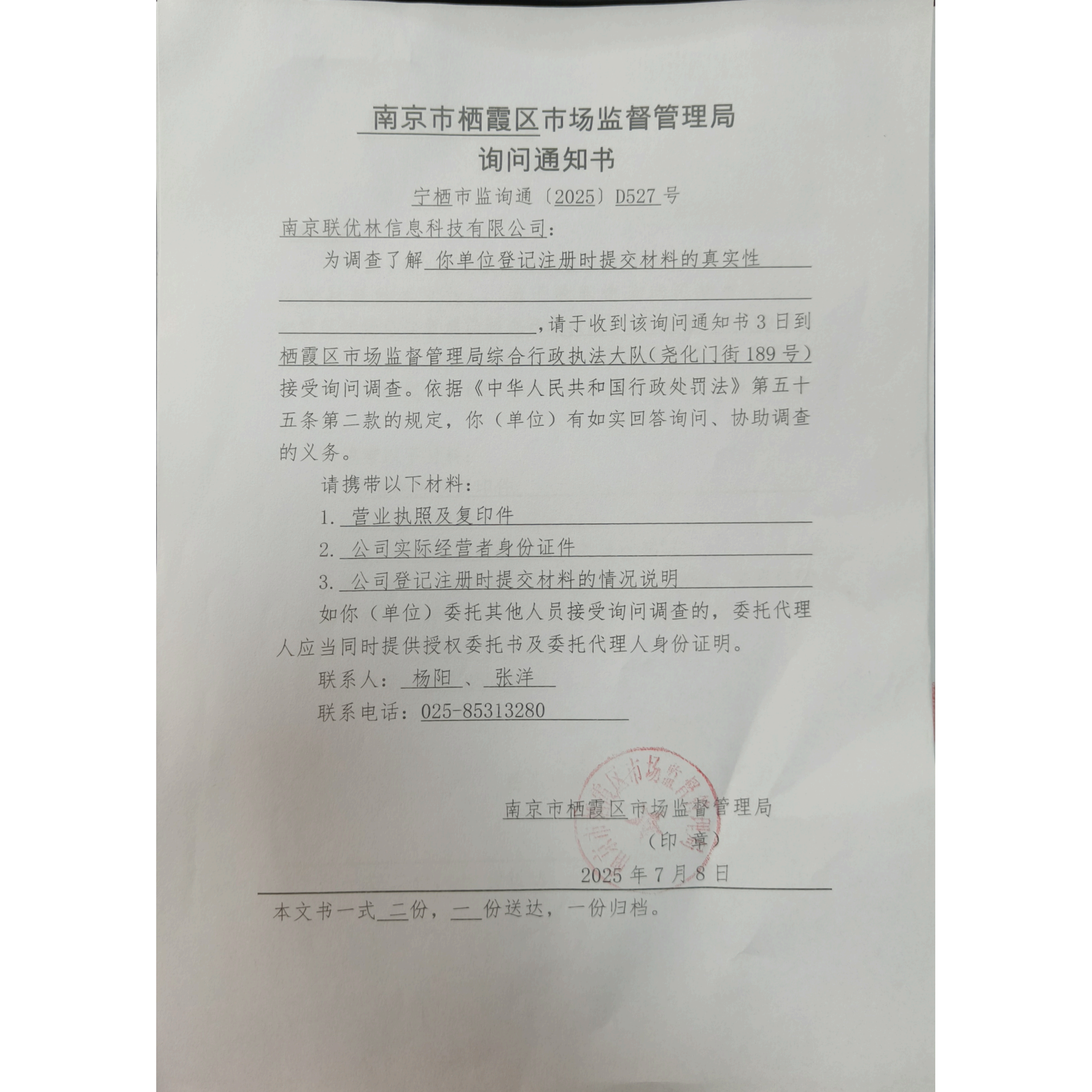 棲霞區市場監督管理局詢問通知書(南京聯優林信息科技有限公司)