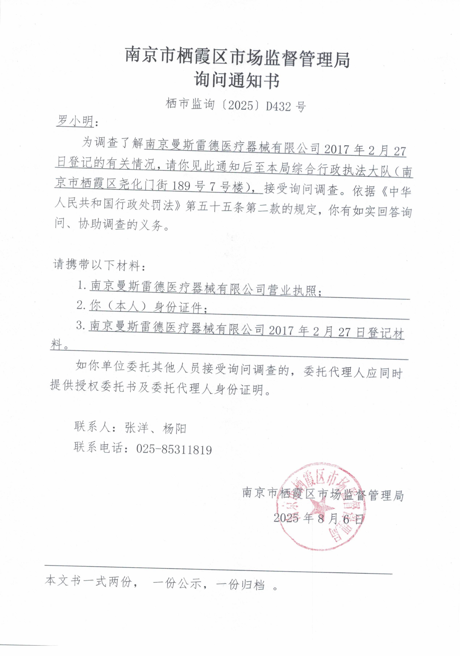 信息名稱:    南京市棲霞區市場監督管理局詢問通知書(南京曼斯雷德醫療器械有限公司)