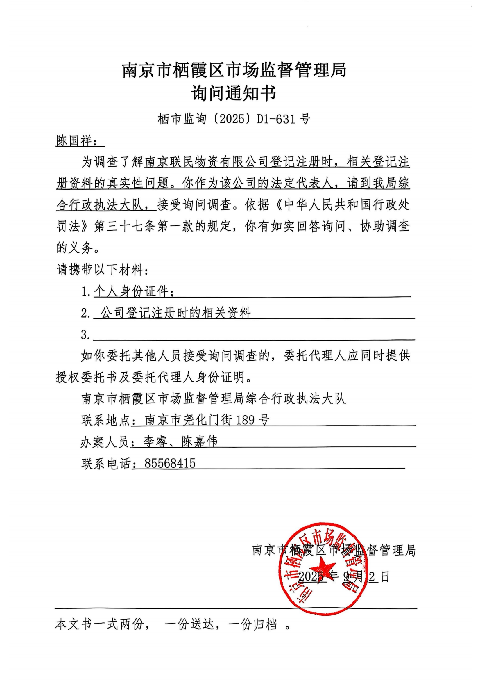 南京市棲霞區市場監督管理局詢問通知書(南京聯民物資有限公司)