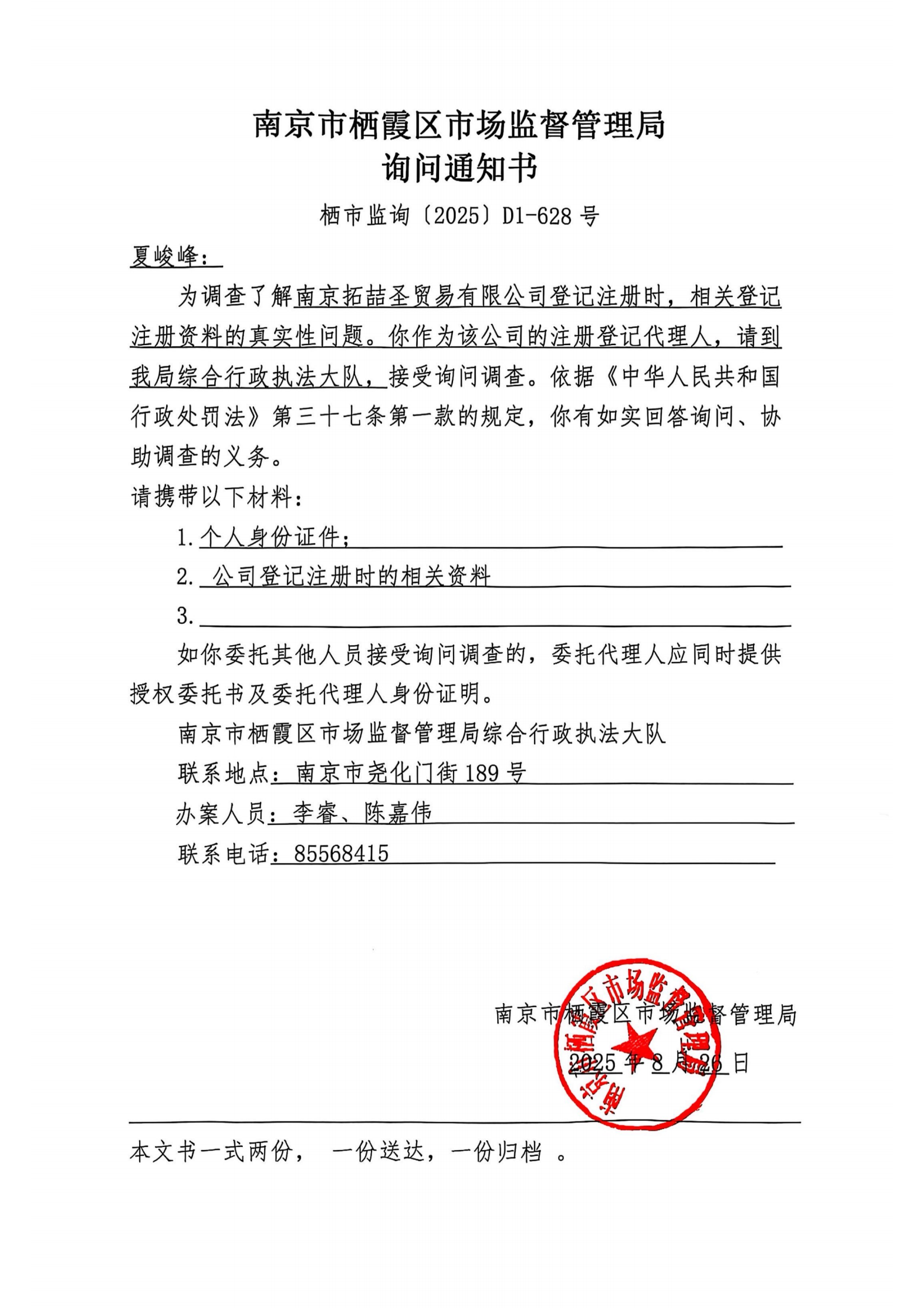 南京市棲霞區市場監督管理局詢問通知書(南京拓喆圣貿易有限公司)