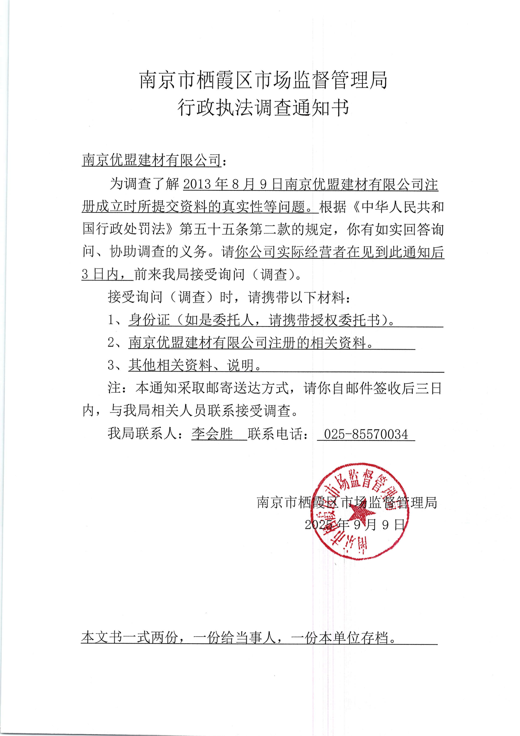 南京市棲霞區(qū)市場監(jiān)督管理局行政執(zhí)法調(diào)查通知書(南京優(yōu)盟建材有限公司)