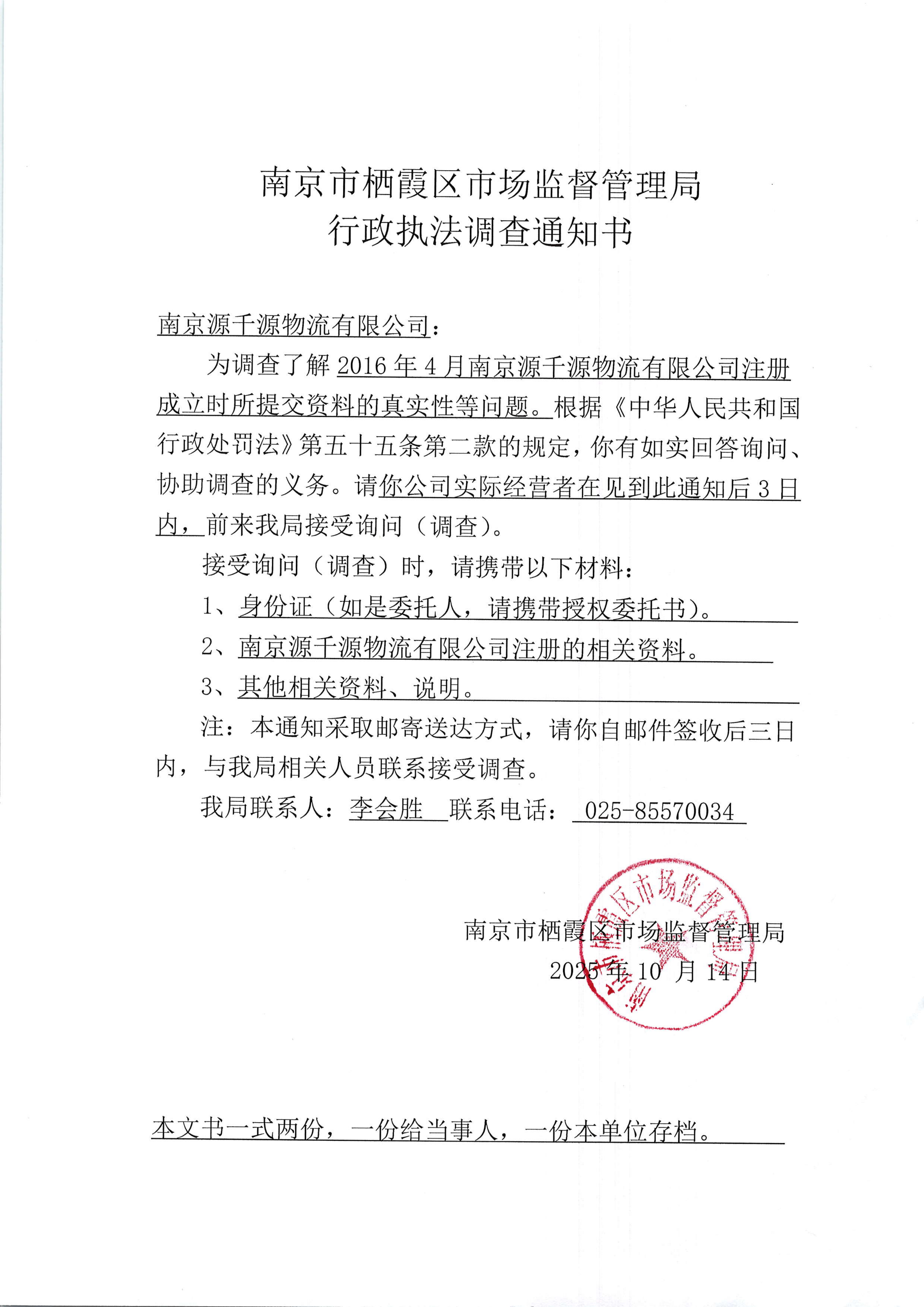 南京市棲霞區(qū)市場監(jiān)督管理局行政執(zhí)法調(diào)查通知書(南京源千源物流有限公司)