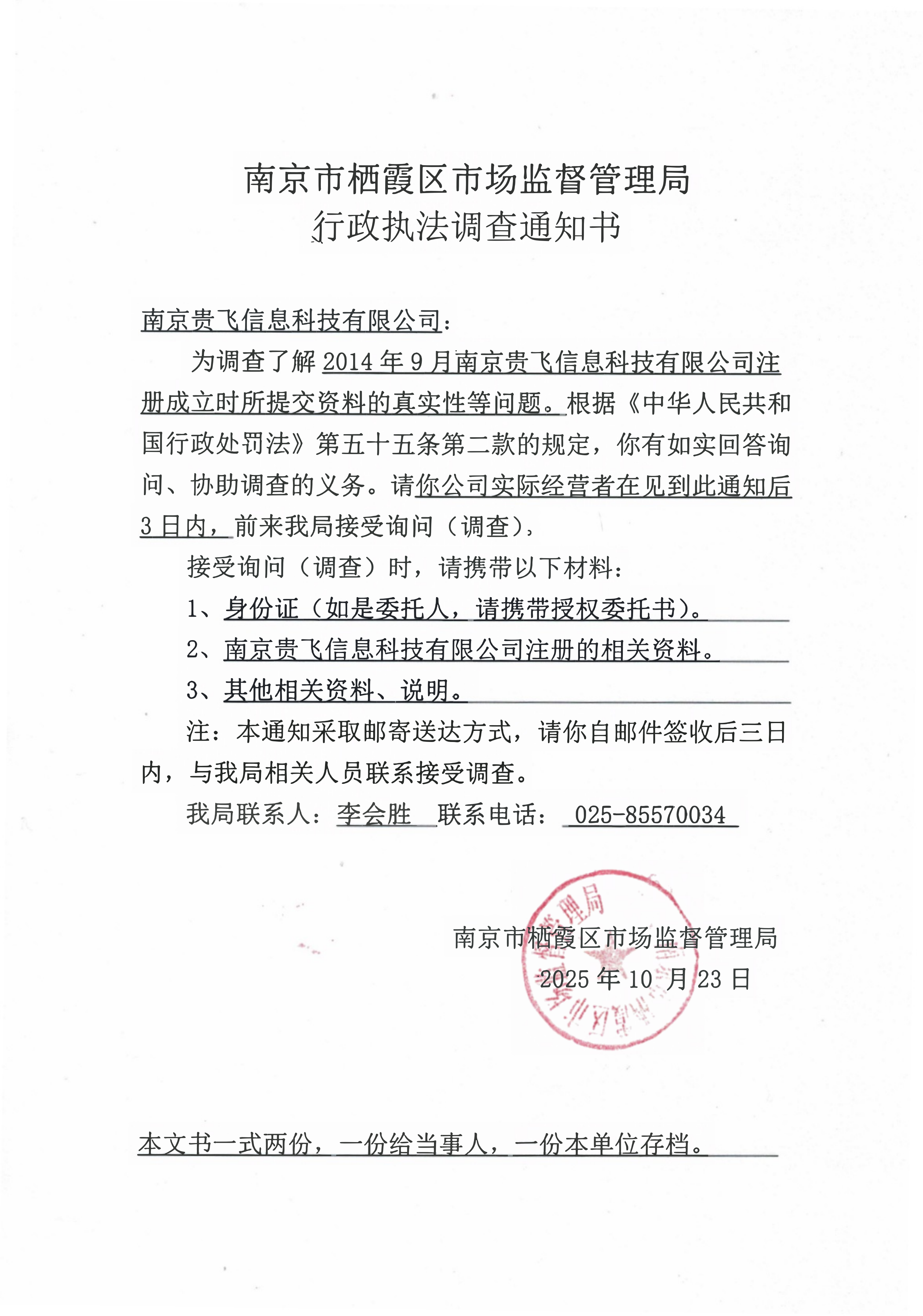 南京市棲霞區市場監督管理局行政執法調查通知書(南京貴飛信息科技有限公司)