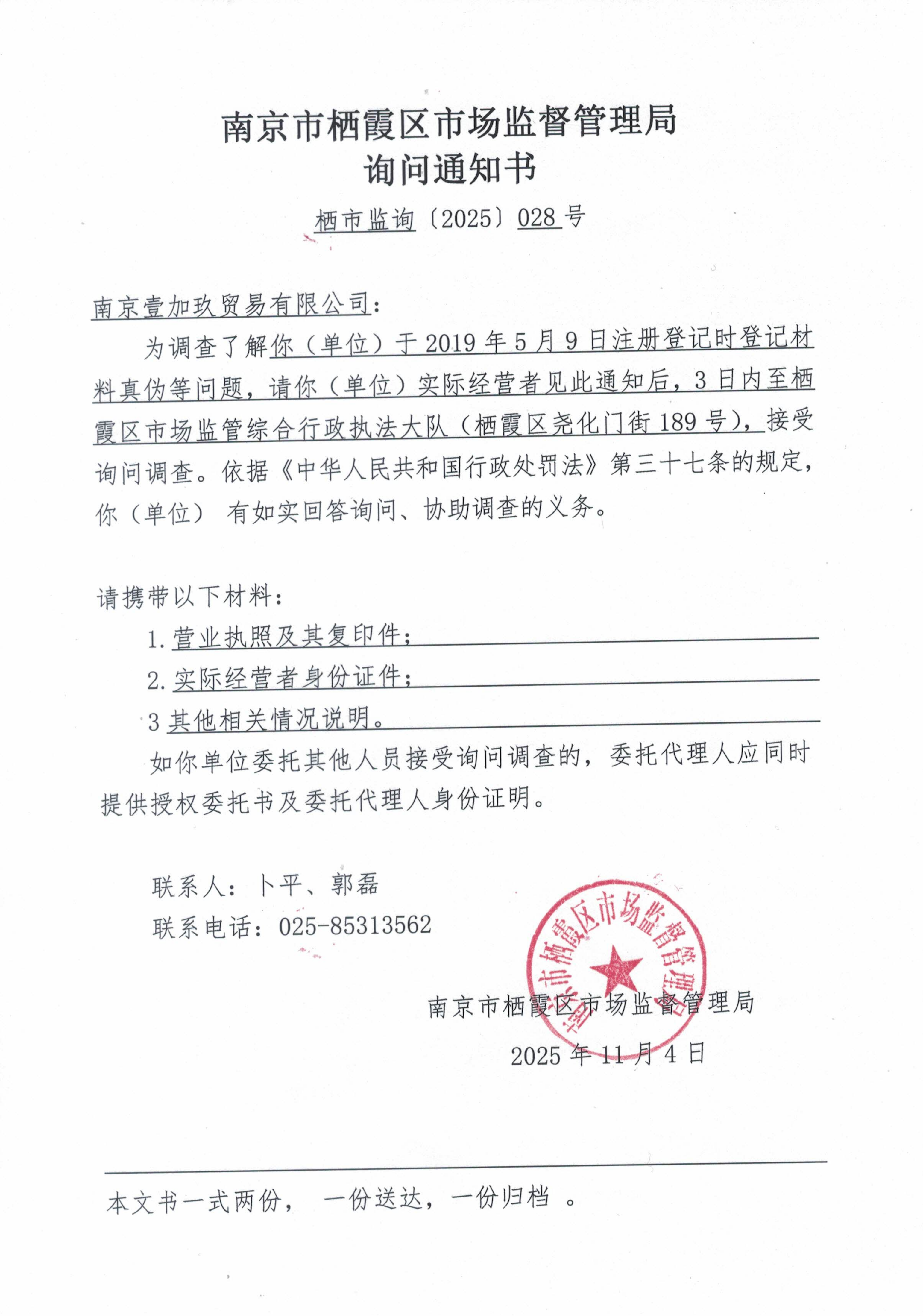 南京市棲霞區(qū)市場監(jiān)督管理局詢問通知書(南京壹加玖貿(mào)易有限公司)