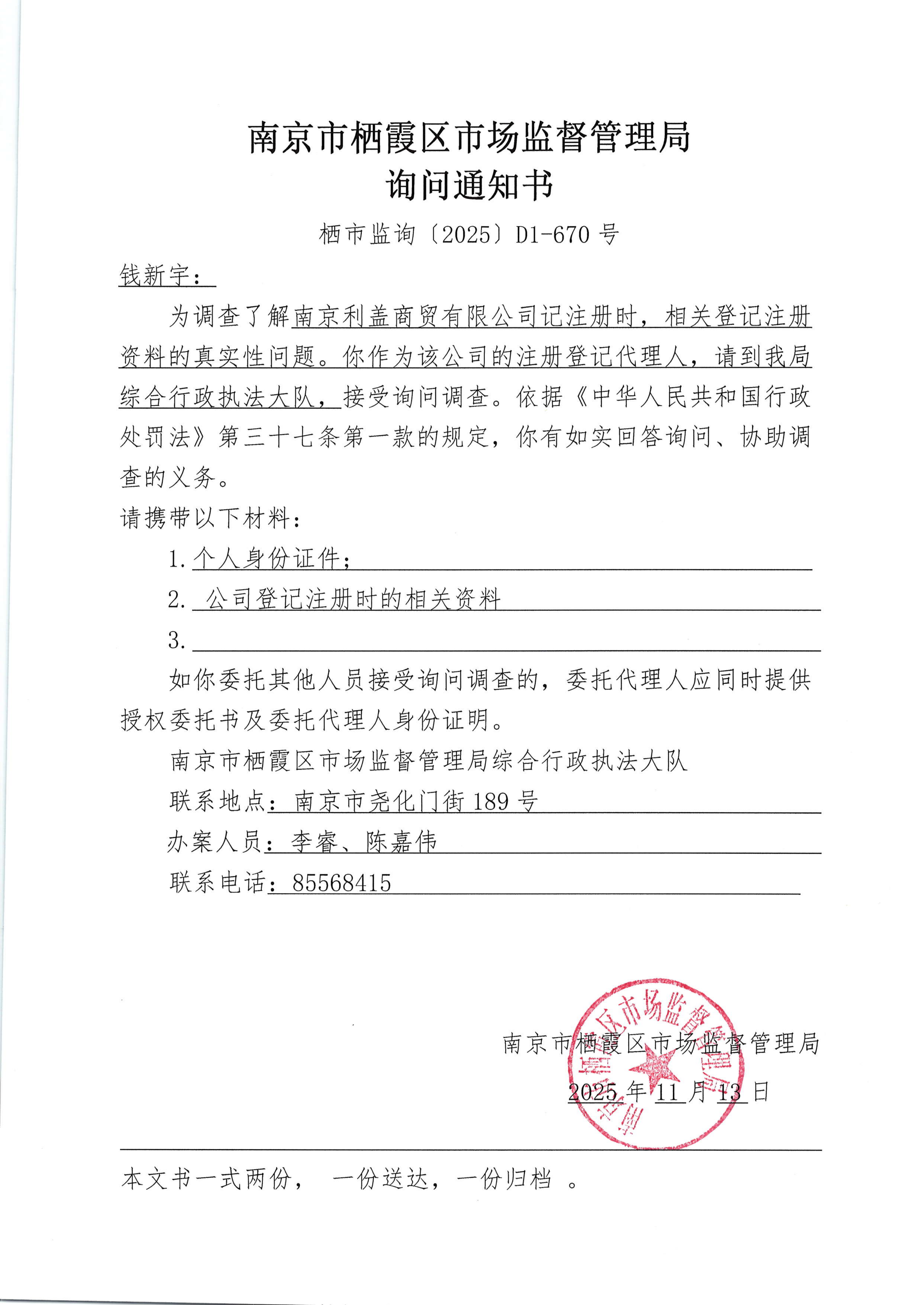 南京市棲霞區市場監督管理局詢問通知書(南京利蓋商貿有限公司)