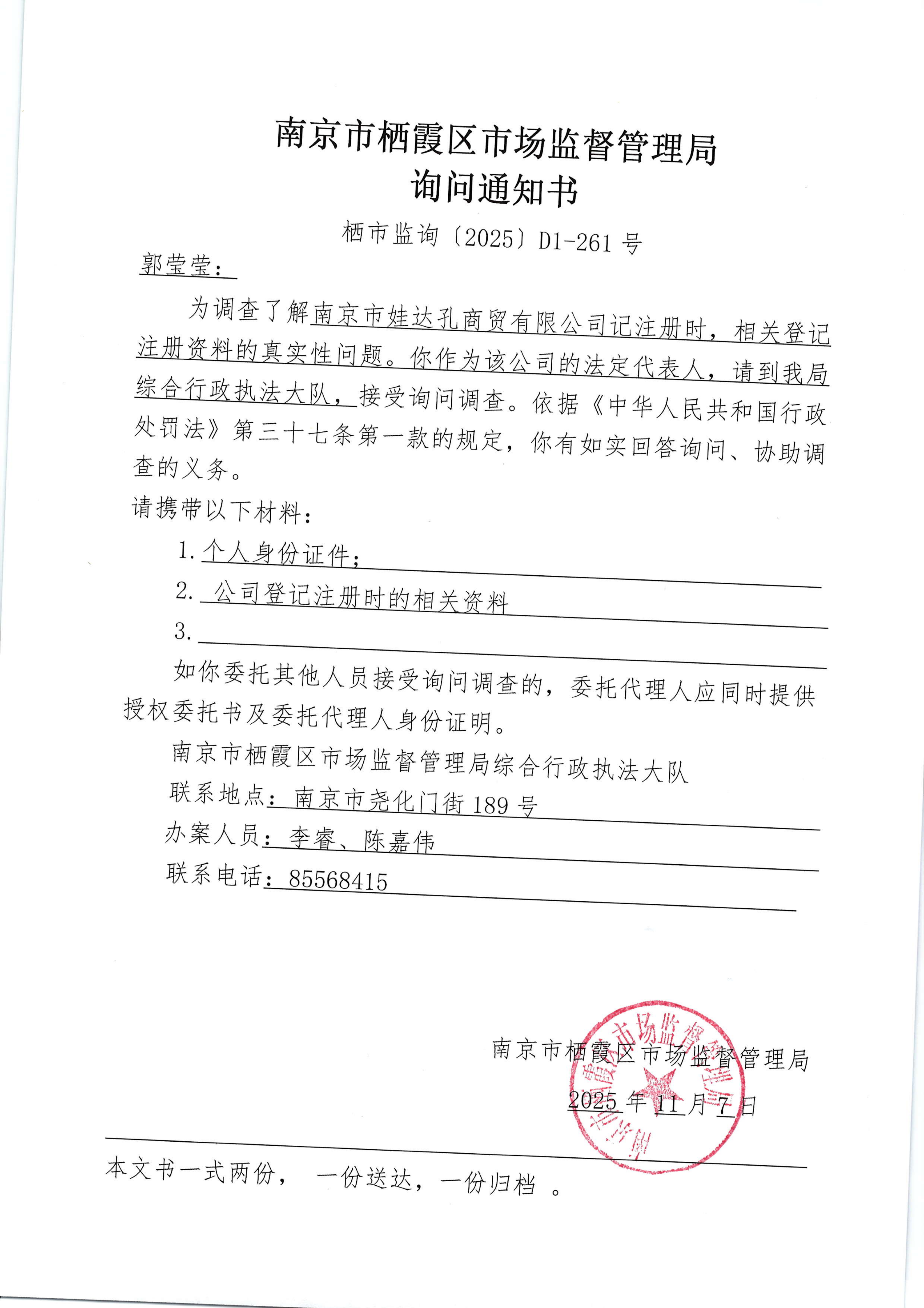 信息名稱:    南京市棲霞區市場監督管理局詢問通知書(南京市娃達孔商貿有限公司)