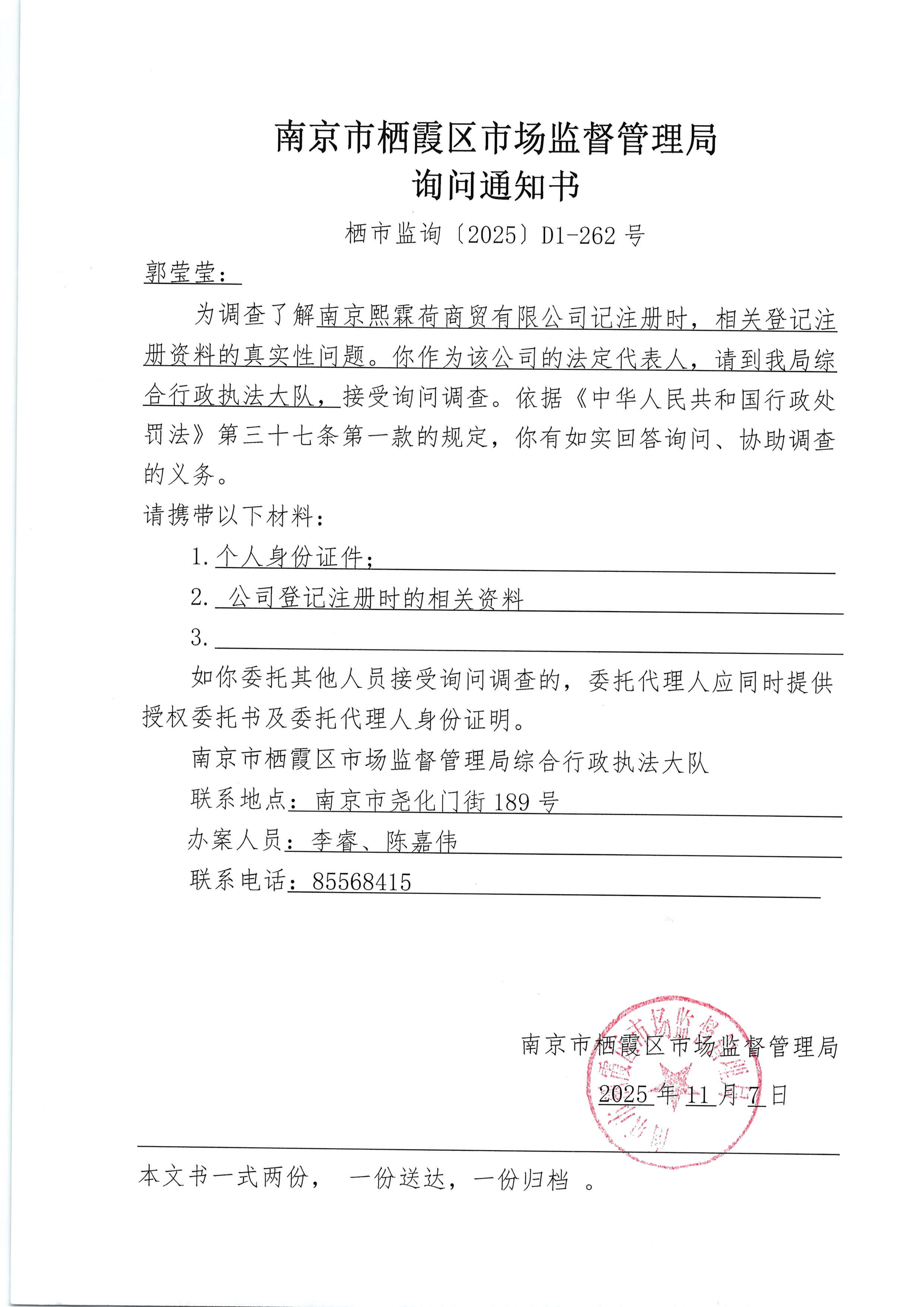 南京市棲霞區(qū)市場(chǎng)監(jiān)督管理局詢問(wèn)通知書(shū)(南京熙霖荷商貿(mào)有限公司)