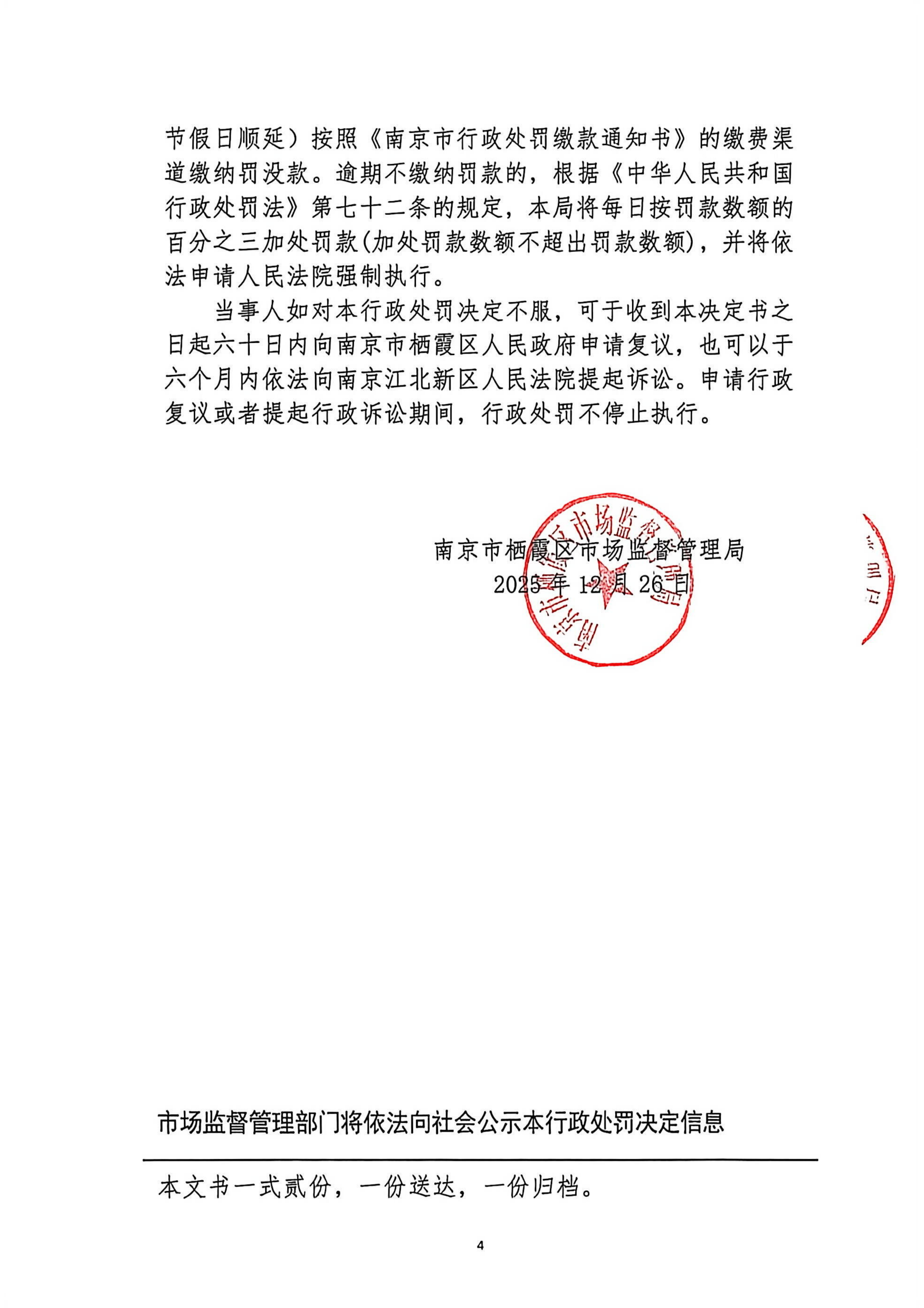 南京市棲霞區(qū)市場(chǎng)監(jiān)督管理局行政處罰決定書(寧棲市監(jiān)處罰【2025】X00076號(hào))