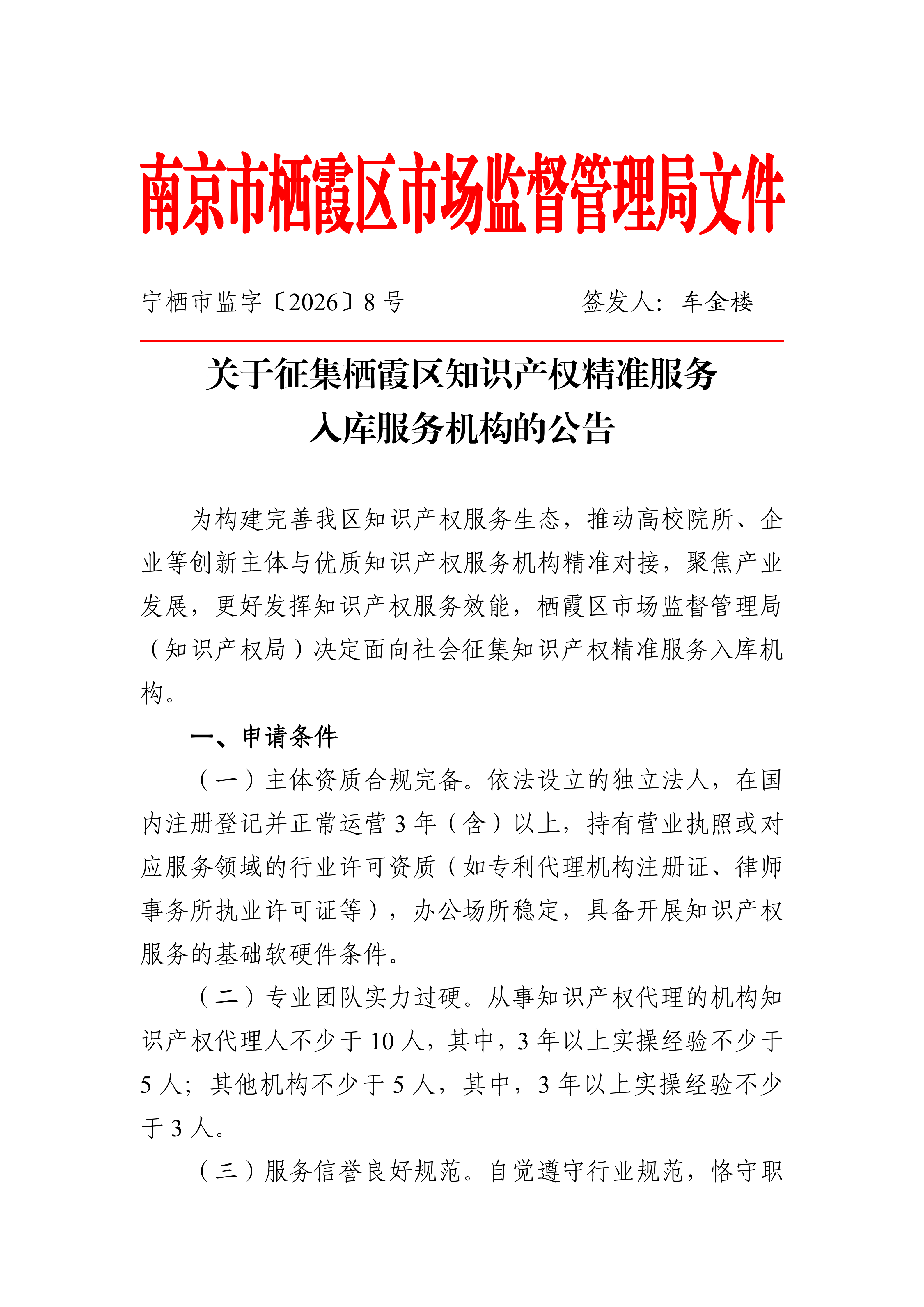 關于征集棲霞區知識產權精準服務入庫服務機構的公告