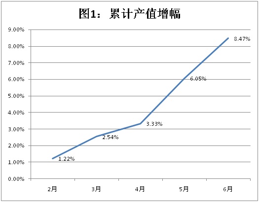 從圖1可見,2月、3月、4月產值增幅穩步提升,平均每月上升1個百分點,56月產值增幅提升明顯,2個月內上升了5個百分點。