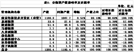 由表1可見,南京經濟技術開發區直管企業對產值增長的影響率和對目標的貢獻率都是最高的,和產值占比相匹配。另外,龍潭街道和馬群街道雖然產值占比僅5.39%0.6%,但由于增幅在20%左右,對增長的影響率分別為5.39%1.46%,對目標的貢獻率更是達到了57.69%17.52%。棲霞街道和八卦洲街道,雖然產值同比上升,但是增幅低于8%,因此對產值增長的影響率為2.85%0.03%,而對目標的貢獻率卻是-18.89%-0.06%。其他街道產值同比都呈下降狀態,其中燕子磯街道和邁皋橋街道降幅分別達到83.71%39.76%,對目標的貢獻率分別為-25.63%-19.99%