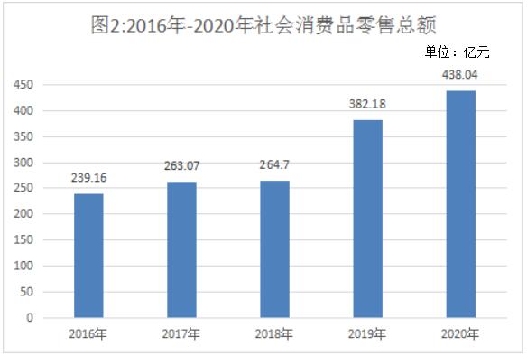 消費市場運行總體平穩。2020年,全區實現社會消費品零售總額438.04億元,比上年增長1.3%。其中,限額以上企業實現零售額250.52億元,同比增長11.7%。