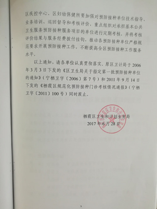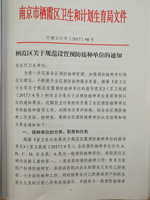 棲霞區(qū)關(guān)于規(guī)范設(shè)置預(yù)防接種單位的通知
