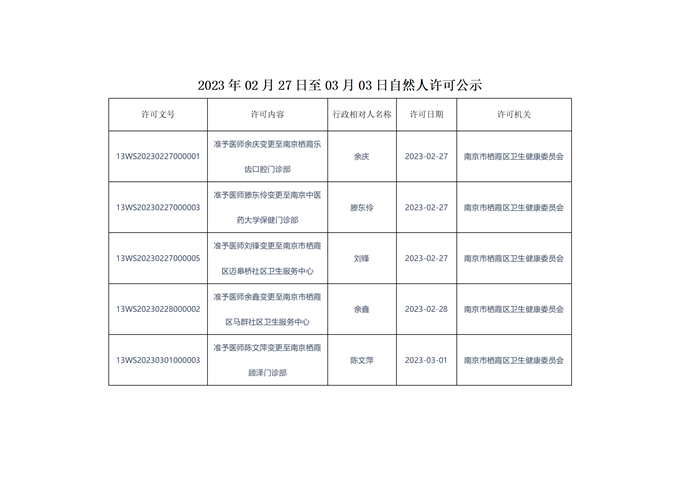 信息名稱:    2023年02月27日至03月03日自然人許可公示