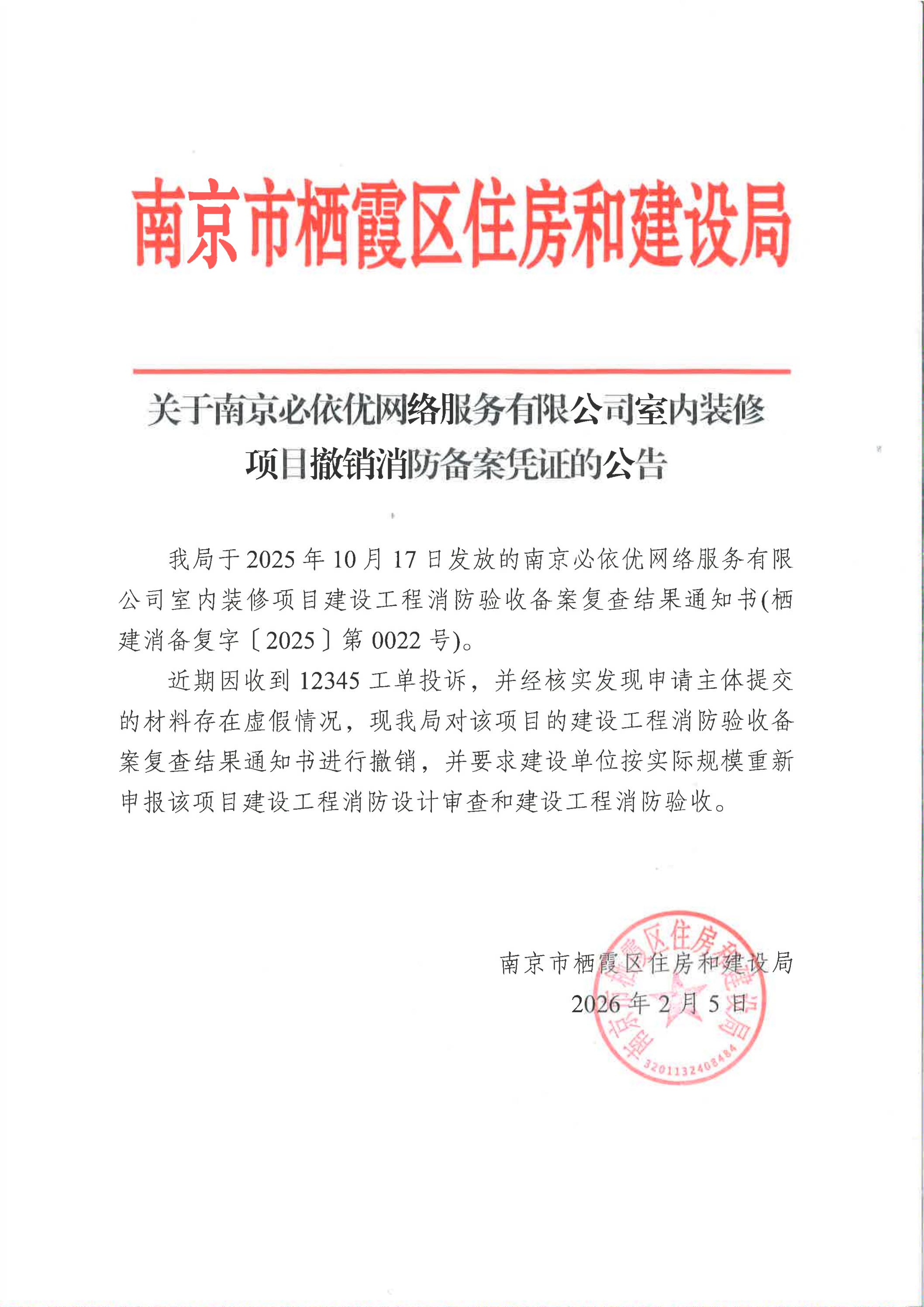 關(guān)于南京必依優(yōu)網(wǎng)絡服務有限公司室內(nèi)專修項目撤銷消防備案憑證的公告