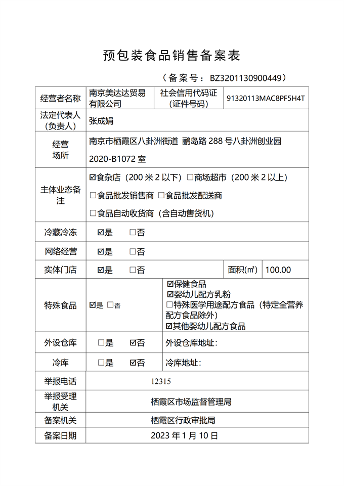 信息名稱:    南京美達達貿易有限公司預包裝食品銷售備案公示