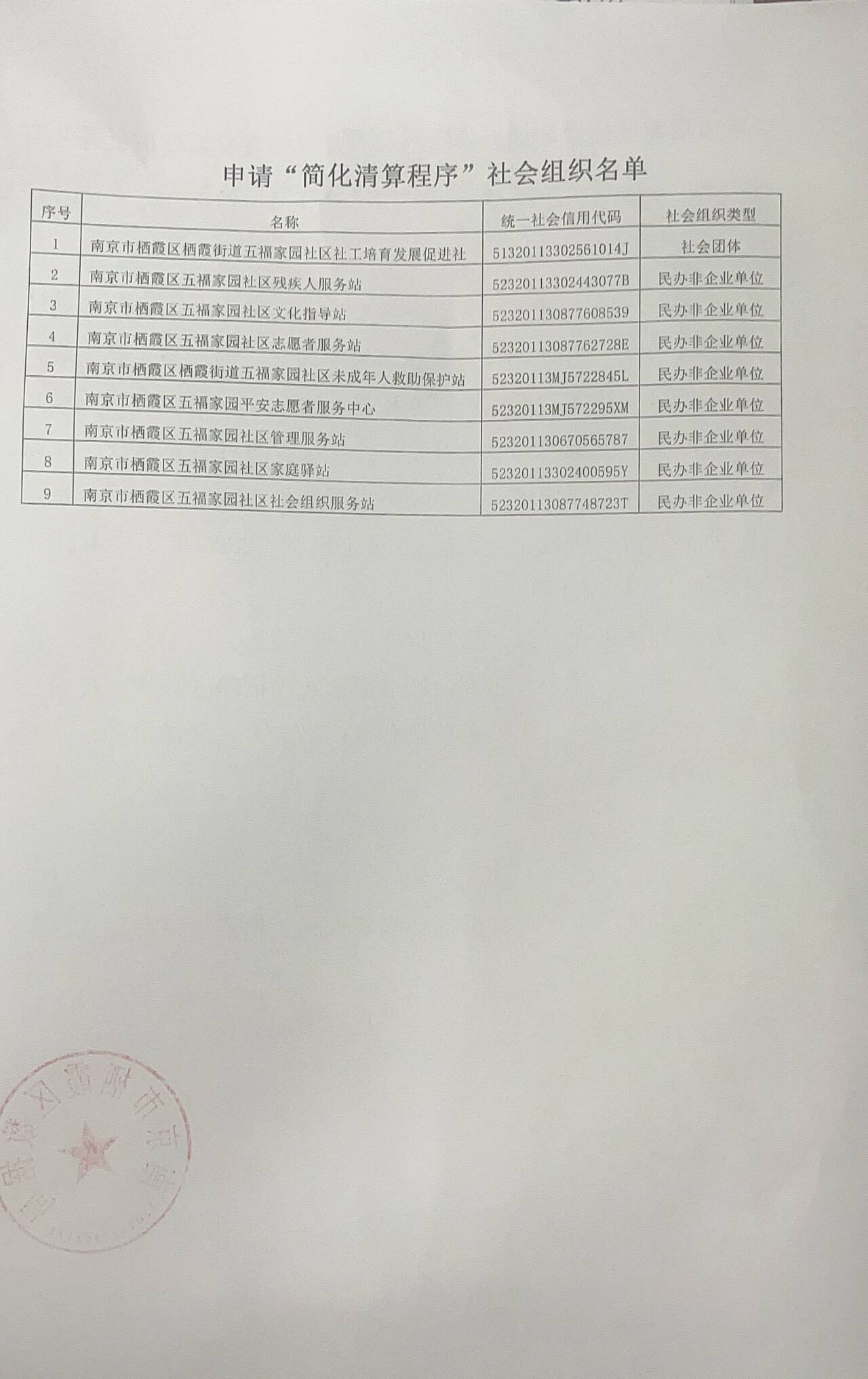 南京市棲霞區棲霞街道五福家園社區社工培育發展促進社等9家社會組織注銷“簡化清算程序”公示