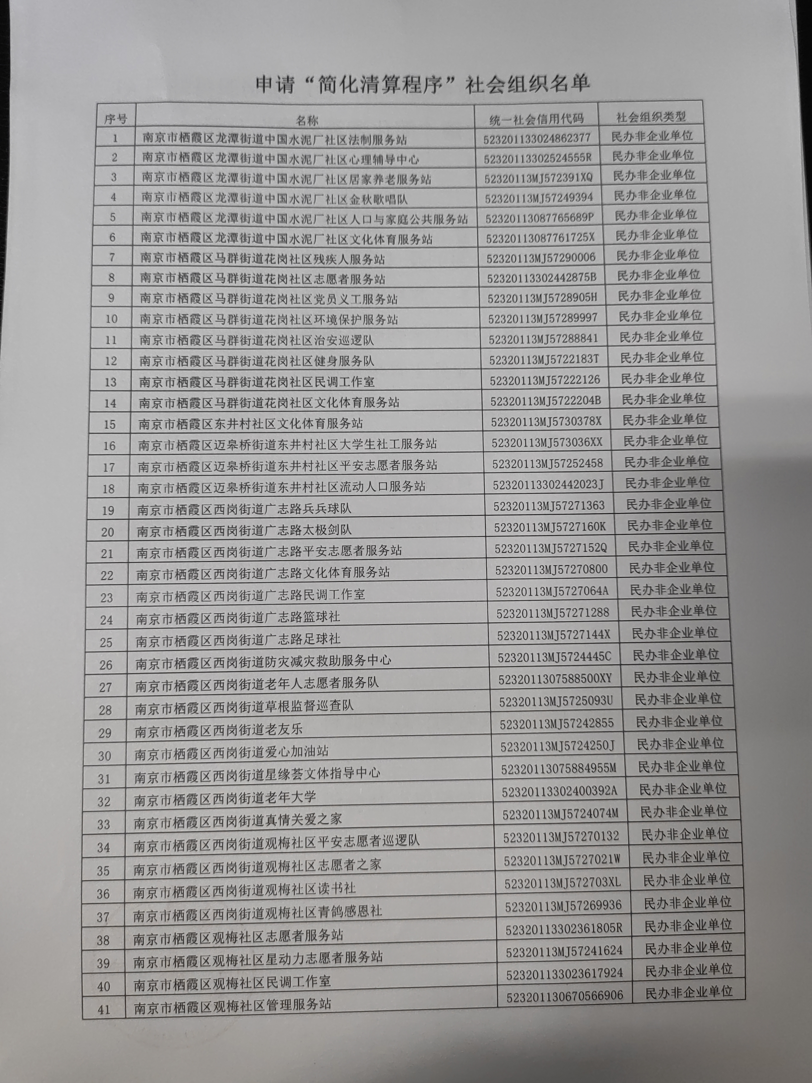 南京市棲霞區龍潭街道中國水泥廠社區法制服務站等41家社會組織注銷“簡化清算程序”公示