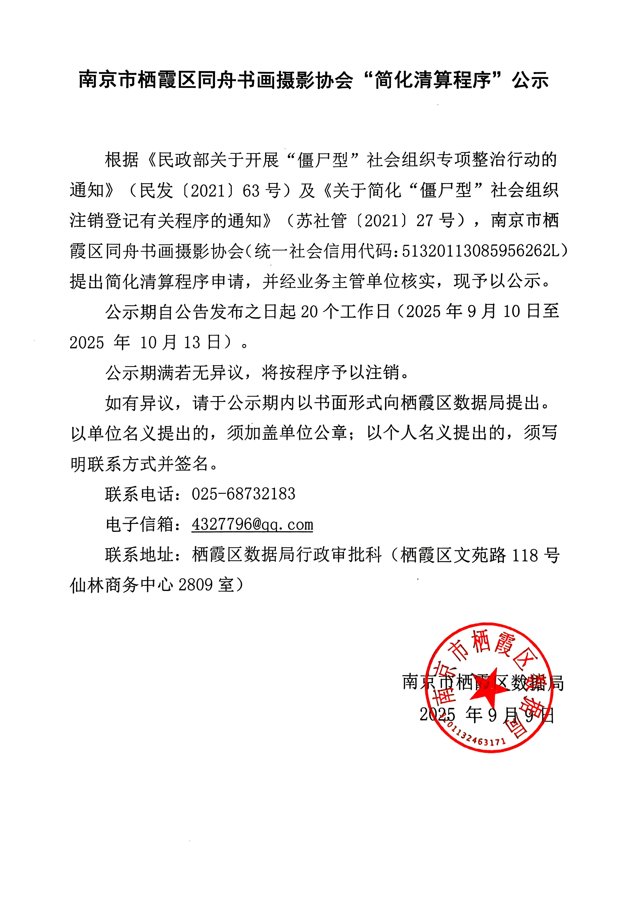 南京市棲霞區(qū)同舟書畫攝影協(xié)會(huì)“簡化清算程序”公示