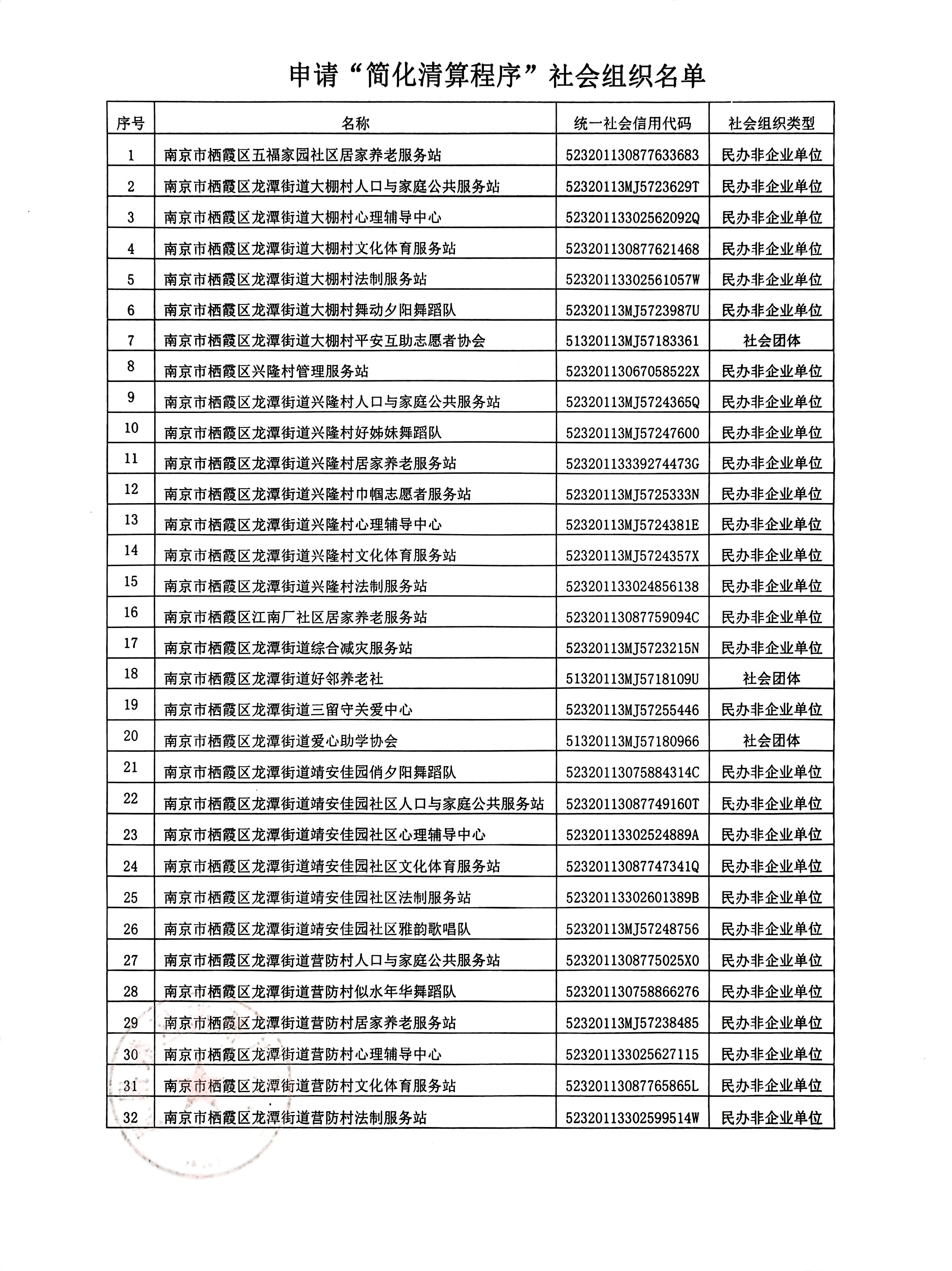 信息名稱:    南京市棲霞區五福家園社區居家養老服務站等32家社會組織注銷“簡化清算程序”公示