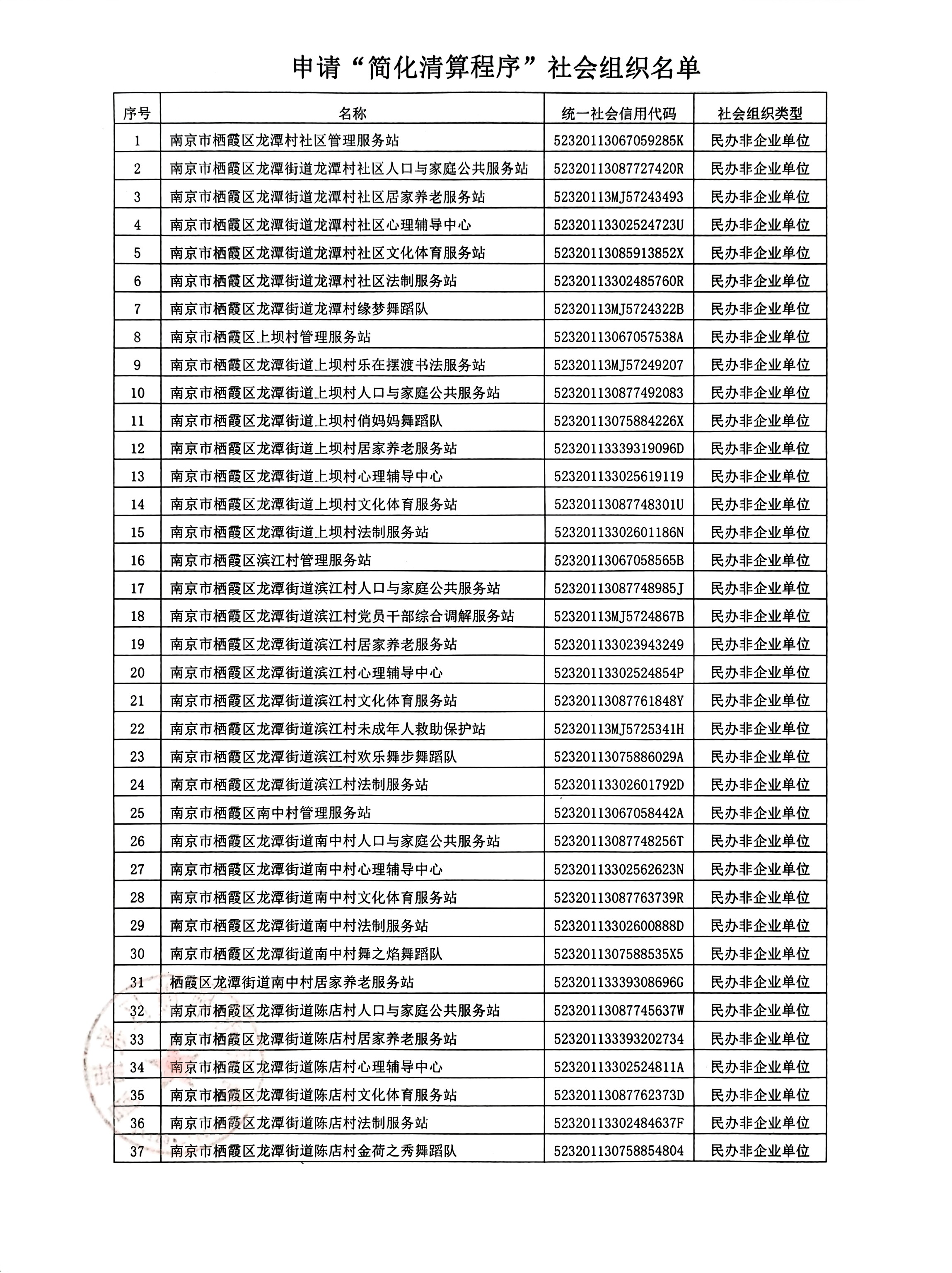 南京市棲霞區龍潭村社區管理服務站等37家社會組織注銷“簡化清算程序”公示