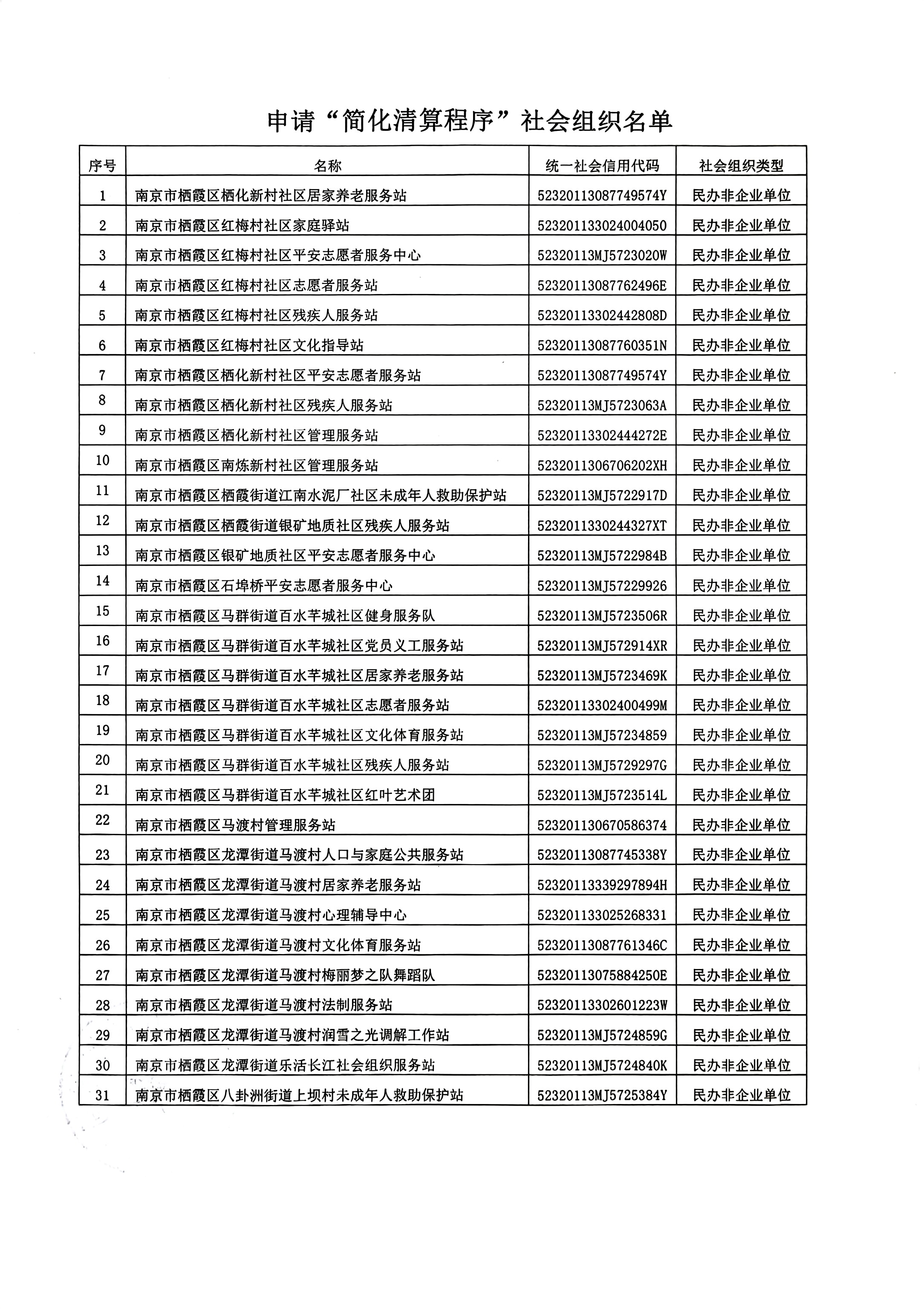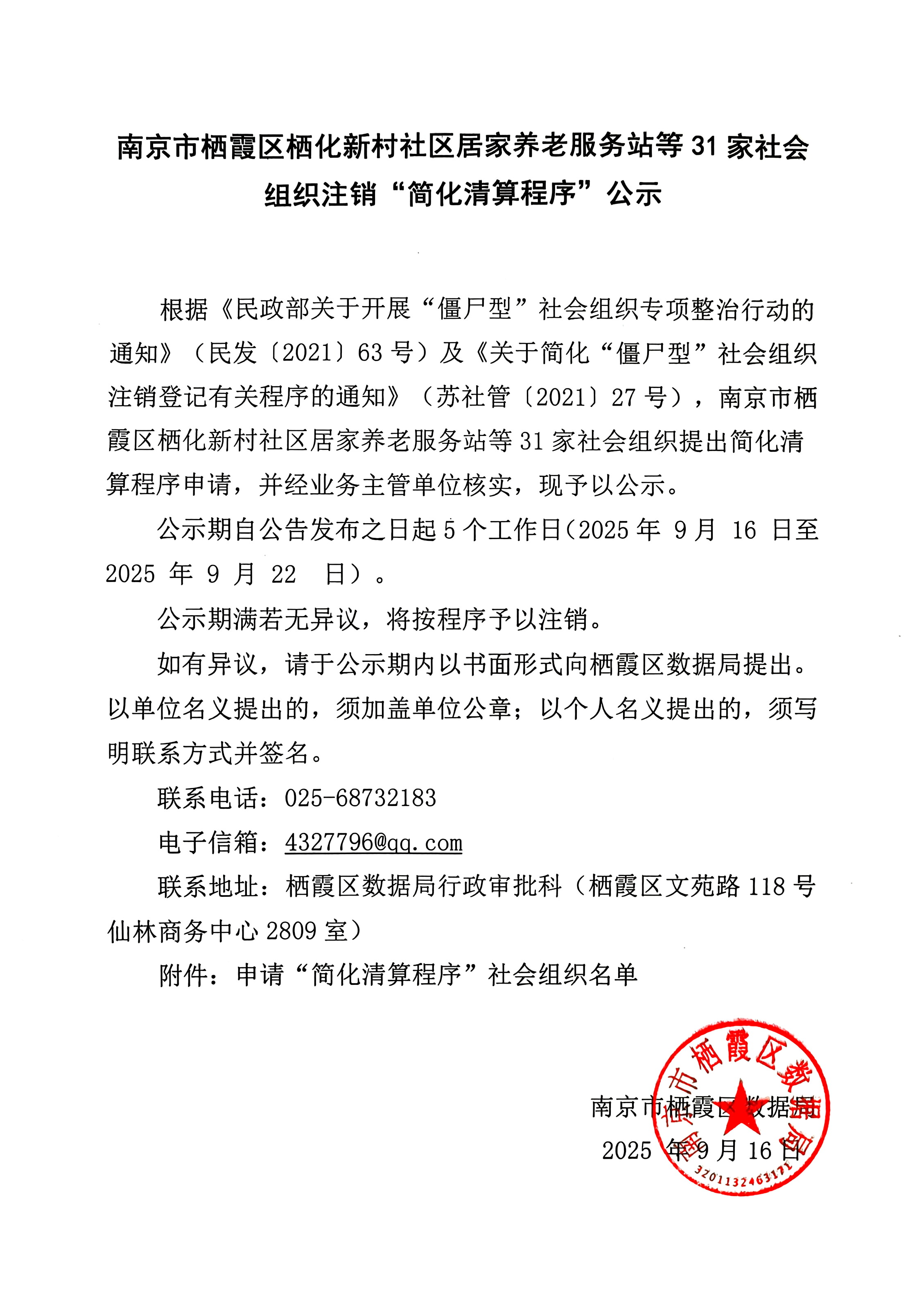 南京市棲霞區(qū)棲化新村社區(qū)居家養(yǎng)老服務(wù)站等31家社會(huì)組織注銷“簡(jiǎn)化清算程序”公示