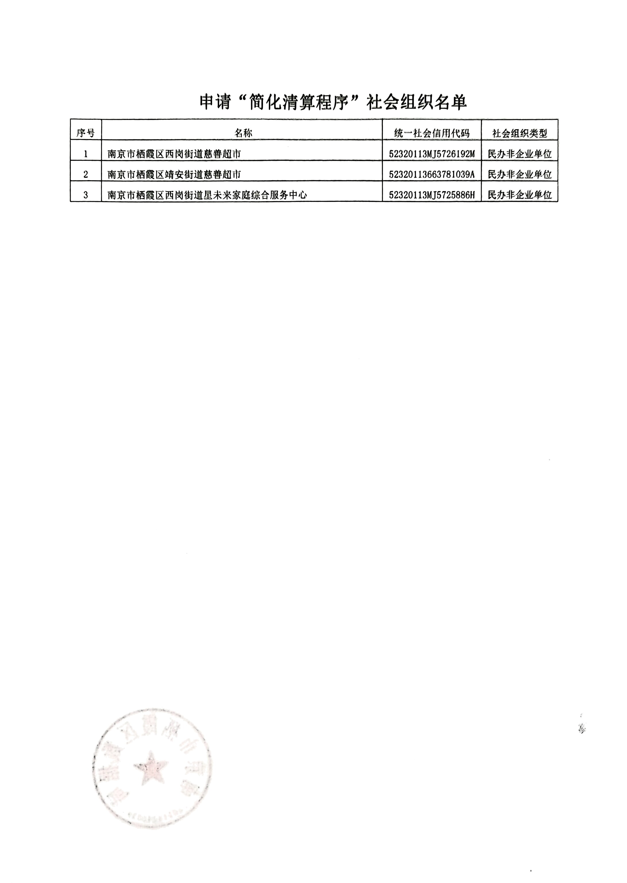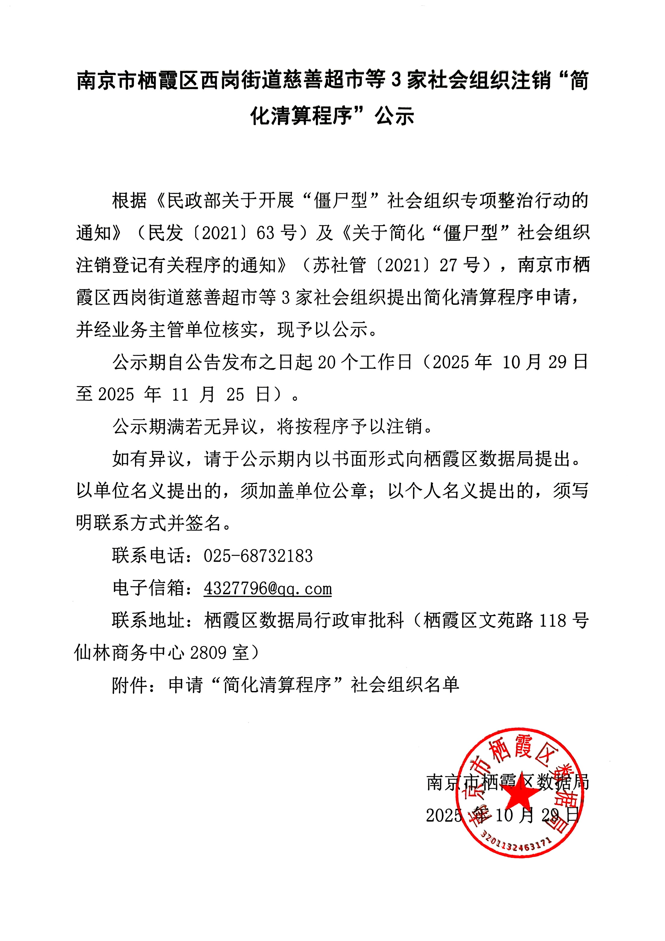 南京市棲霞區西崗街道慈善超市等3家社會組織注銷“簡化清算程序”公示