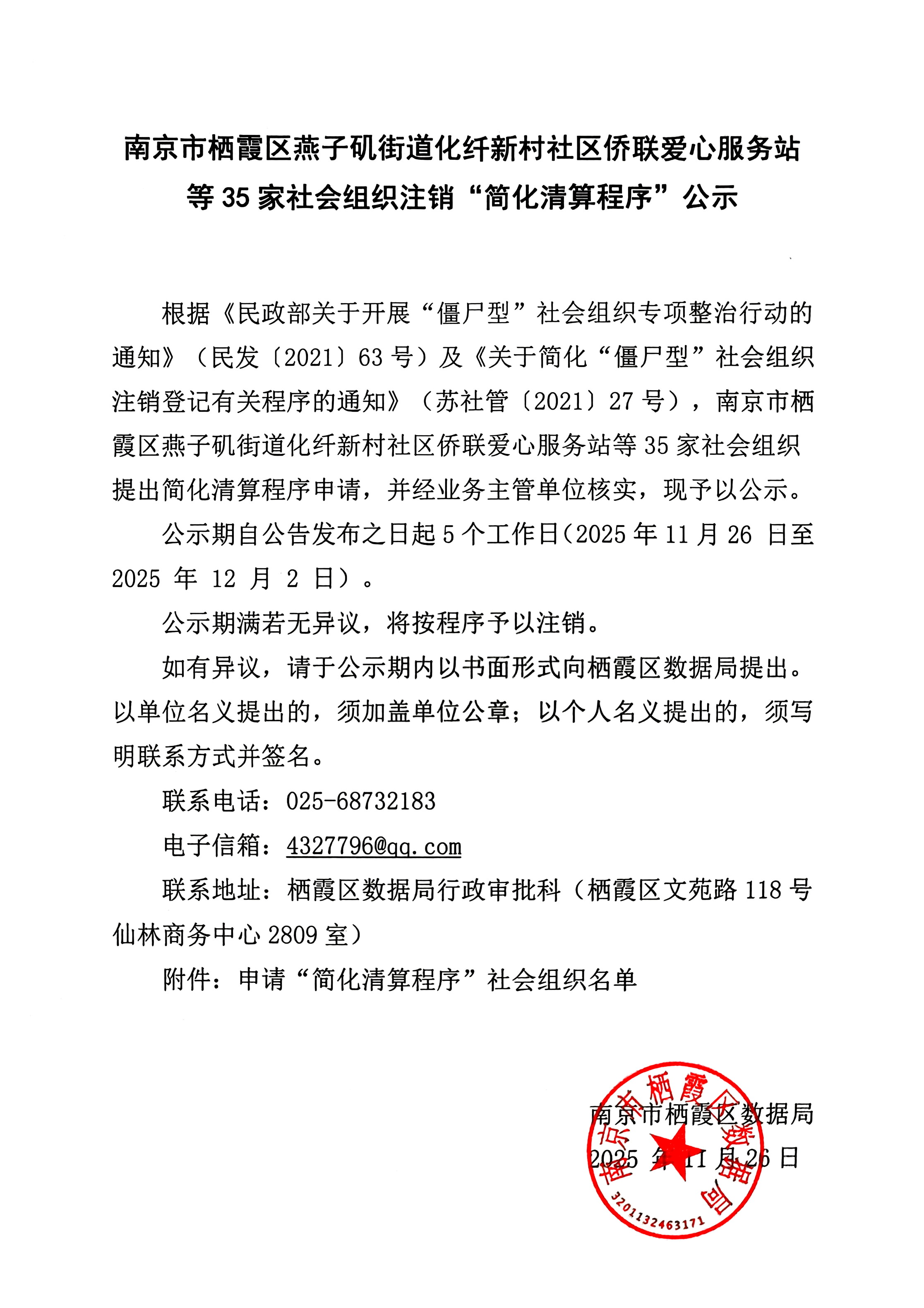 南京市棲霞區燕子磯街道化纖新村社區僑聯愛心服務站等35家社會組織注銷“簡化清算程序”公示