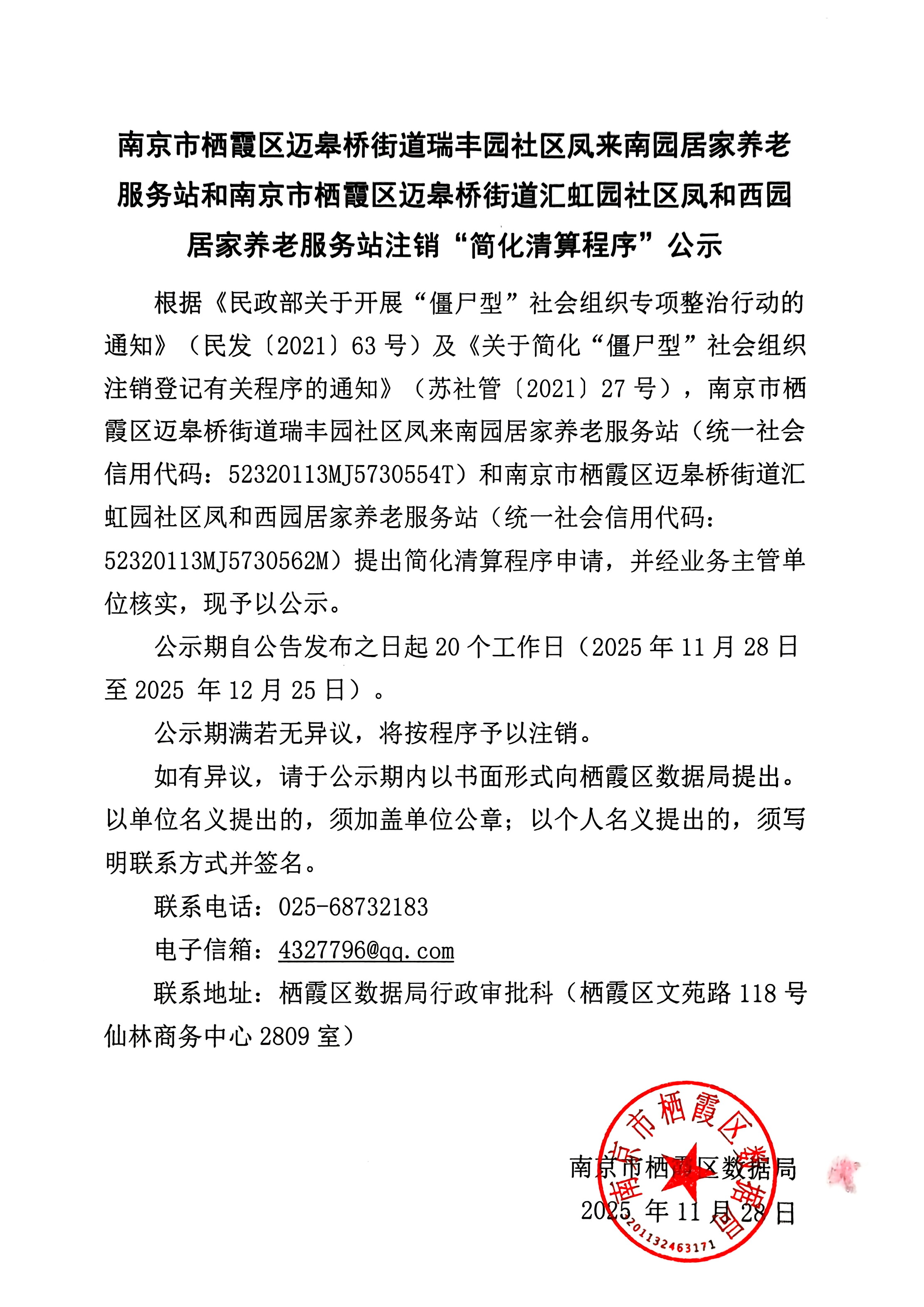 南京市棲霞區邁皋橋街道瑞豐園社區鳳來南園居家養老服務站和南京市棲霞區邁皋橋街道匯虹園社區鳳和西園居家養老服務站注銷“簡化清算程序”公示
