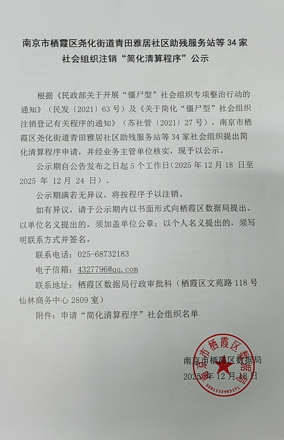 南京市棲霞區堯化街道青田雅居社區助殘服務站等34家社會組織注銷“簡化清算程序”公示